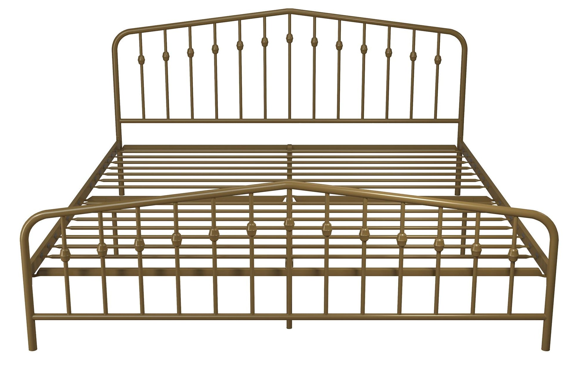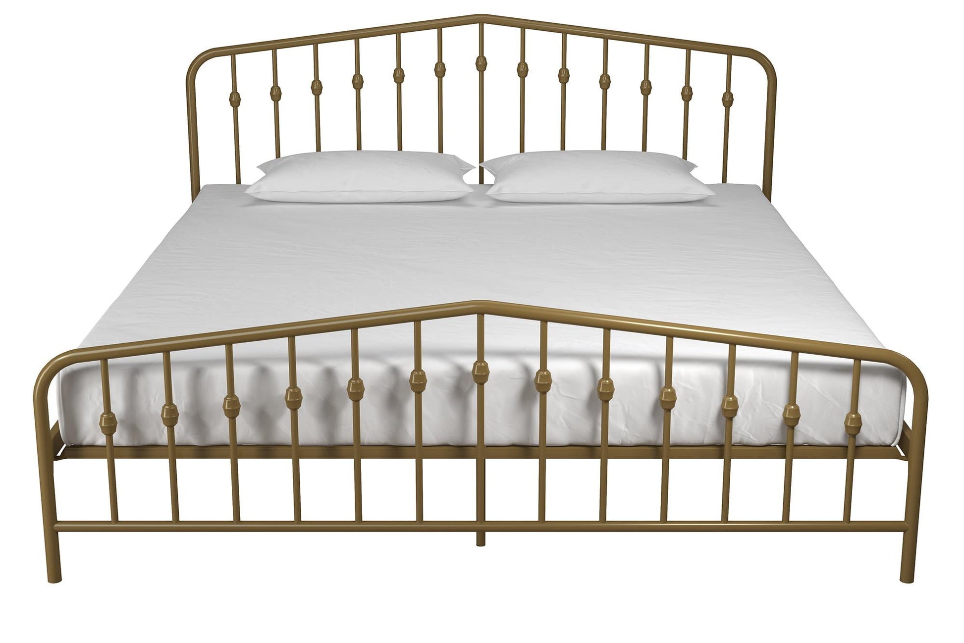 Get inspired to introduce fresh ideas into your bedroom to create a look that is both cozy and elegant. The Novogratz Bushwick Metal Bed has a simple design that will perfectly complement rooms of any style and decor. With round finials featured on the headboard and footboard posts, its style and color can be easily combined with bold colors and accessories to brighten up the room. Complete with metal slats, side rails and center legs, this bed's sturdy construction provides full support and comfort to the body and mattress. The metal slats remove the need for any additional box spring or foundation, while also providing your mattress with much needed support and breathability. For your convenience, the Novogratz Bushwick Metal Bed has two base heights - 7" or 11" clearance, to give you the option to use the under bed space as extra storage space for seasonal clothing and accessories. Available in multiple sizes and colors, there is the perfect Bushwick for every home.Modern Farmhouse Design: Rustic meets industrial with a stylish spindle bed that showcases a sleek curved edge headboard and footboard for a fresh bedroom look. Great bed for kids, teens, adults or guests. Available in multiples sizes and colors Adjustable Height: Designed to maximize space, the adjustable bed frame's height can be installed at 7" from the floor for a lower profile or 11" for more under bed clearance and storage space. Dimensions: 82.5"L x 78"W x 42"H. Weight limit: 900 lbs. Sturdy construction: Strong metal structure creates a stable frame supported by center legs and a metal bar for superior stability. Premium powder coated metal finish provides a smooth and longer lasting finish that protects against corrosion, rust No Box Spring Needed: Heavy duty metal slats ensure excellent air flow and support your mattress without the need for a box spring. The secured slats and raised sides keep your mattress in place to prevent it from sliding Hassle-free Assembly: All tools and instructions are included and easy to follow. Get answers to all your questions with customer support 7 days a week by phone, email or chat. Easily order parts online or by phone. Enjoy a 1 year limited warranty