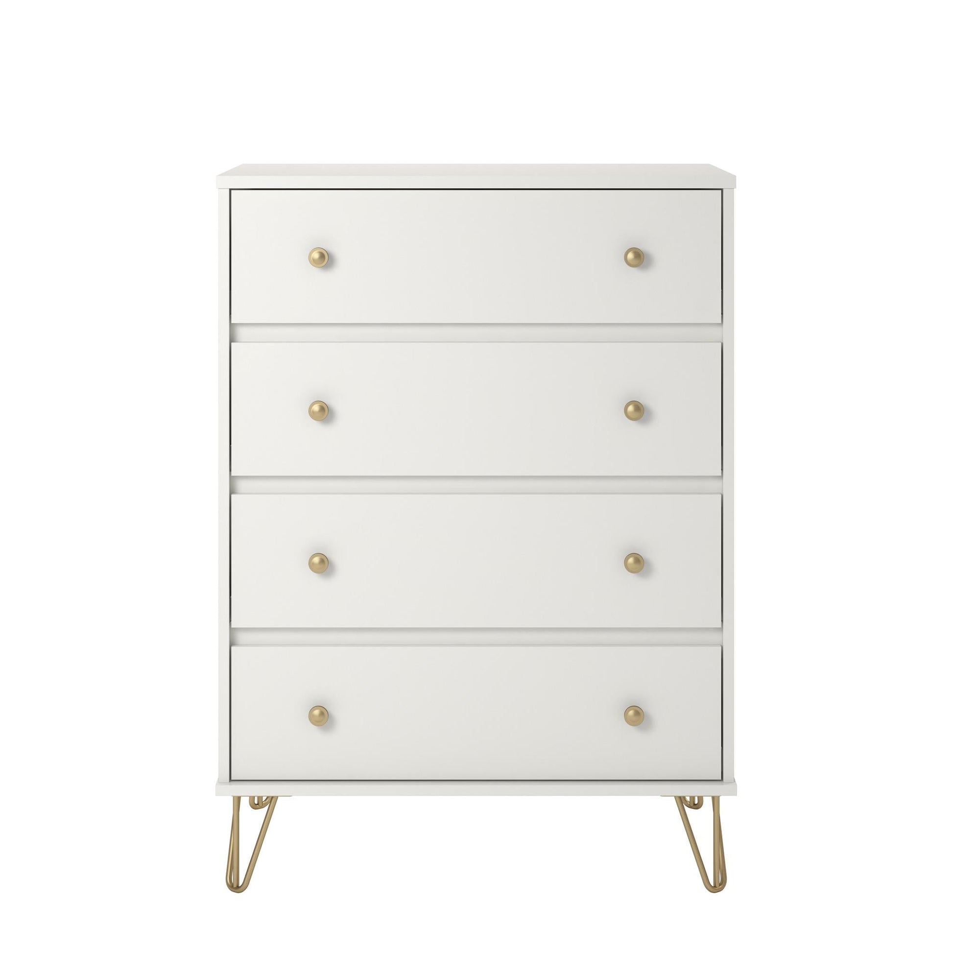 Free up closet space with the Novogratz Finley 4 Drawer Dresser. The white finish on the laminated particleboard adds a modern touch while the brassy gold metal hairpin legs bring a mid-century retro feel for a stylish piece you will love. Declutter your closet by storing away your folded t-shirts, jeans, and extra linens in the 4 spacious drawers. The durable metal slides on each drawer make opening and closing the drawers easy and smooth. Display decorations and family photos on the top surface. A wall anchor kit is included to properly secure the Dresser to the wall to prevent tipping injuries and keep your family safe. The 4 Drawer Dresser ships flat to your door and requires assembly upon opening. Two adults are recommended to assemble. Once assembled, the Dresser measures to be 46.92"H x 31.18"W x 19.69"D.