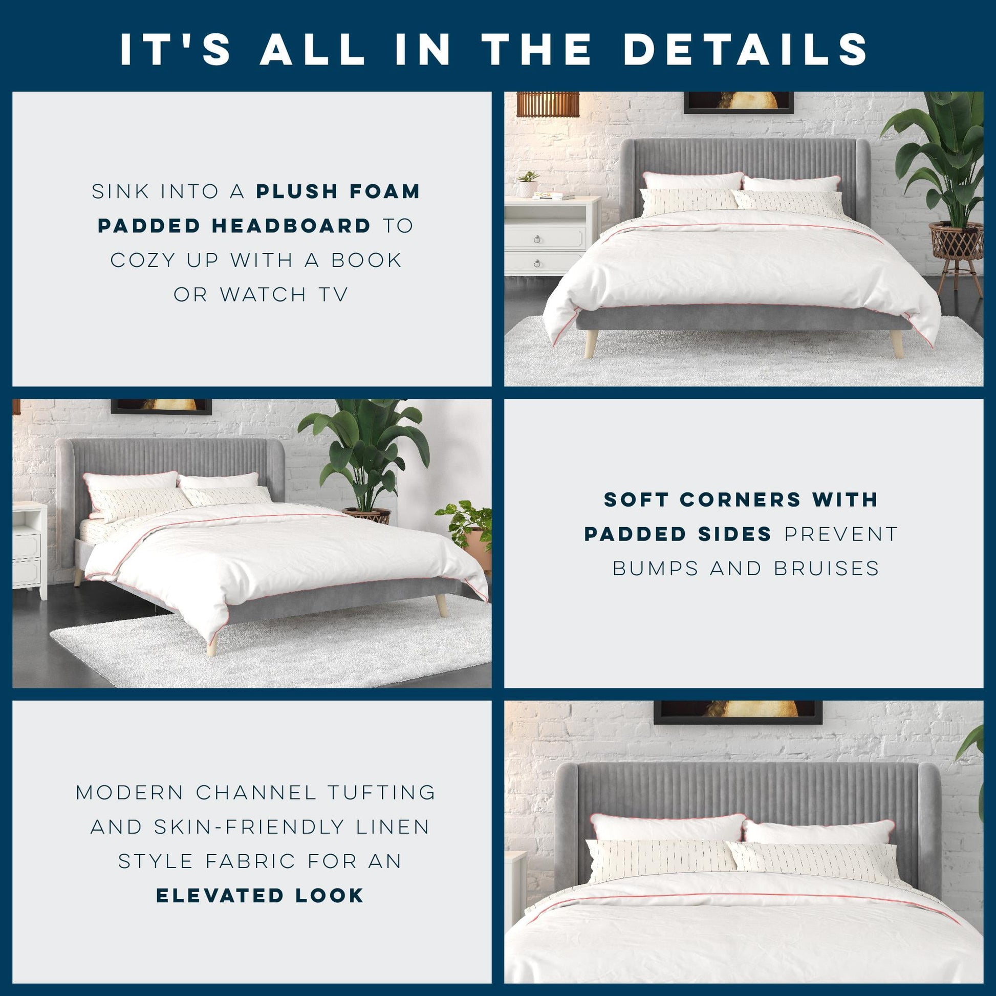 - Bohemian upholstered platform bed comes glammed up with a retro-curved tufted wingback headboard that flashes cosmopolitan vertical ribbed tufting and Scandinavian inspired slanted solid wood natural grain finish legs along its lean corners
