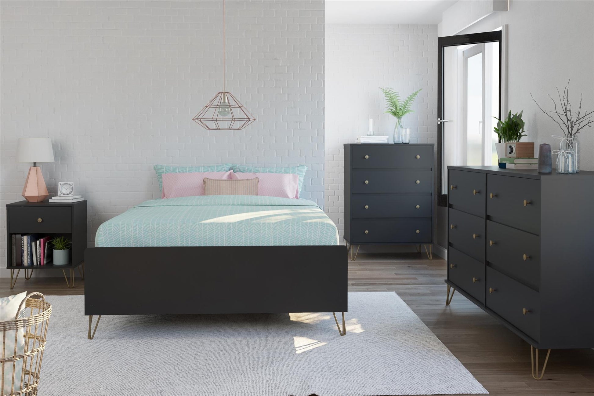 Free up closet space with the Novogratz Owen 4 Drawer Dresser. The black finish on the laminated particleboard adds a modern touch while the gold metal hairpin legs bring a mid-century retro feel for a stylish piece you will love. Declutter your closet by storing away your folded t-shirts, jeans, and extra linens in the 4 spacious drawers. The durable metal slides on each drawer make opening and closing the drawers easy and smooth. Display decorations and family photos on the top surface. A wall anchor kit is included to properly secure the Dresser to the wall to prevent tipping injuries and keep your family safe. The 4 Drawer Dresser ships flat to your door and requires assembly upon opening. Two adults are recommended to assemble. Once assembled, the Dresser measures to be 46.92"H x 31.18"W x 19.69"D.