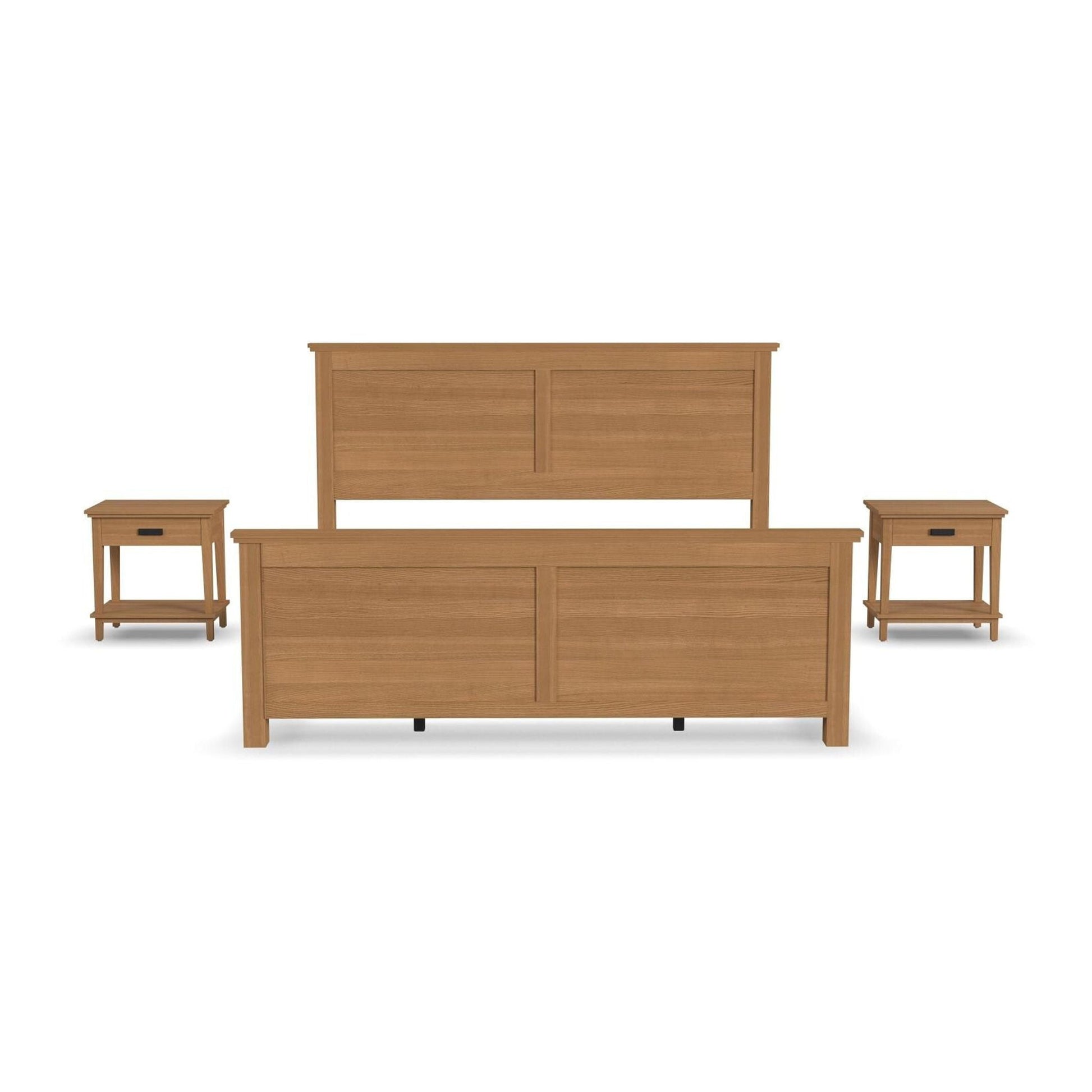 Uncomplicate your life with the simple beauty of the Oak Park collection. The Oak Park King Bed & Two Open Nightstands by Homestyles, are expertly crafted with clean lines and intelligent design. The engineered wood creates a durable core, while the oak veneers show off the unique wood grain. The headboard and footboard feature a timeless double panel design. While the nightstands offer quick access to all your bedside items, with a unique rectangular pull. The open storage area below is perfect for storing your phone or tablet, while the backless detail allows easy access to your cords for charging. Stained in a light oak finish, this craftsman-style bedroom set will fit right in with your existing furniture, or help you create a new look.