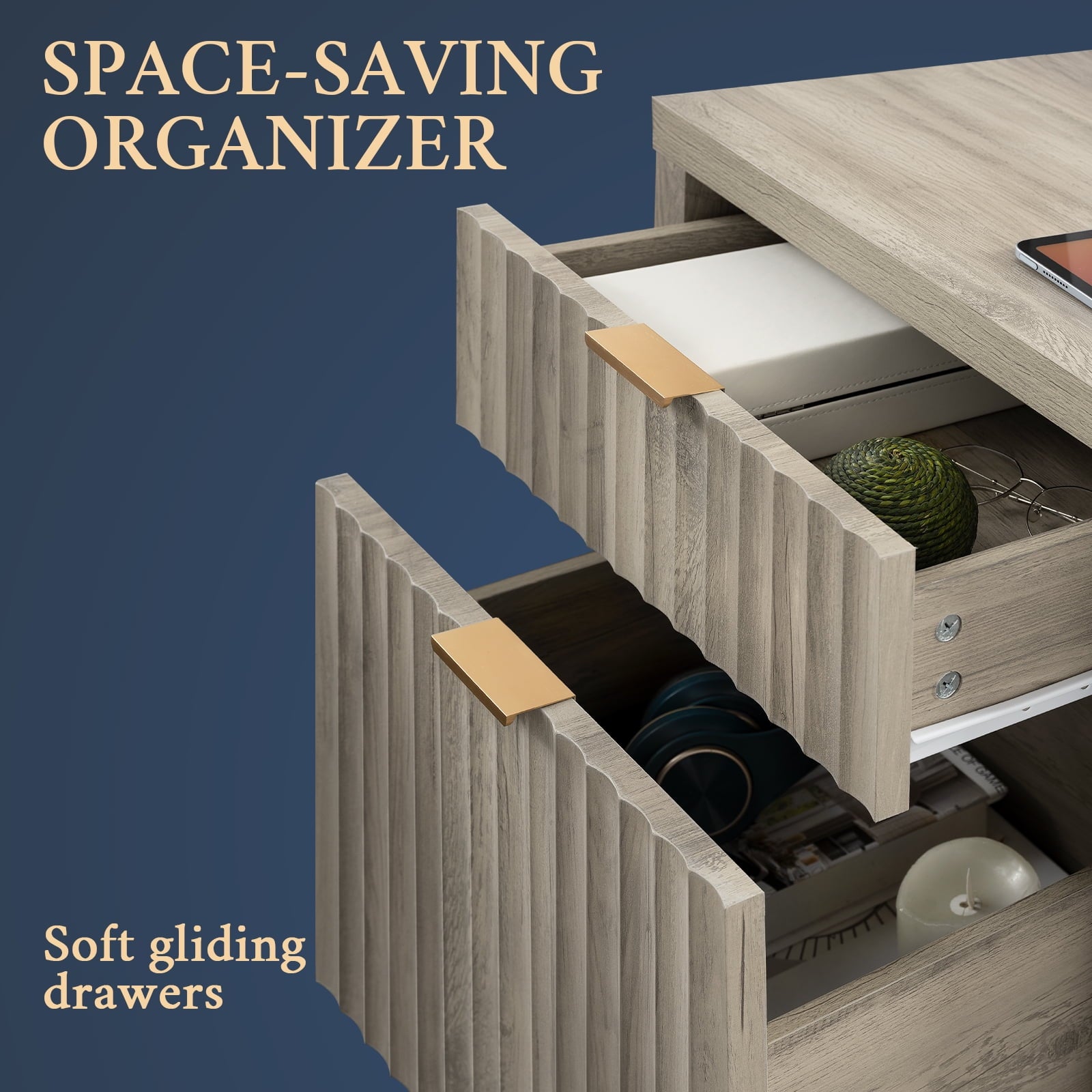 Upgrade your bedroom experience with the OAKHAM Charging Nightstand for bedroom. Equipped with 1 Type-C port, 1 USB port, 2 AC outlets, and a 4.9-foot power cord, this night stand can meet all your charging needs. The bedside table is designed with two spacious drawers to provide different storage needs. With a fluted panel and oak grain finish design, this wooden nightstand combines natural elegance with fashion, blending modern and country styles. Measuring 15.4\