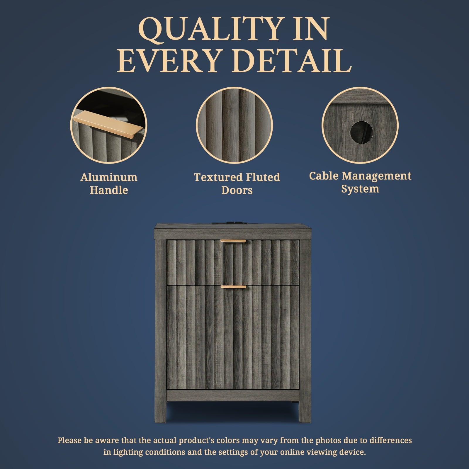 Upgrade your bedroom experience with the OAKHAM Charging Nightstand for bedroom. Equipped with 1 Type-C port, 1 USB port, 2 AC outlets, and a 4.9-foot power cord, this night stand can meet all your charging needs. The bedside table is designed with two spacious drawers to provide different storage needs. With a fluted panel and oak grain finish design, this wooden nightstand combines natural elegance with fashion, blending modern and country styles. Measuring 15.4\