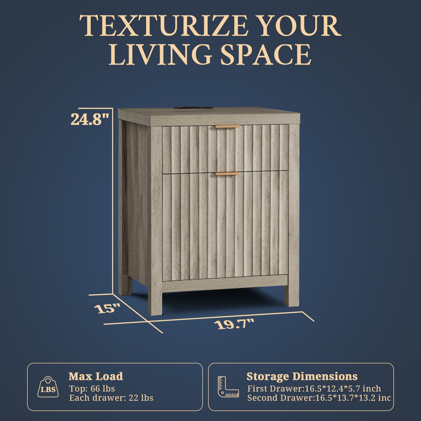 Upgrade your bedroom experience with the OAKHAM Charging Nightstand for bedroom set of 2. Equipped with 1 Type-C port, 1 USB port, 2 AC outlets, and a 4.9-foot power cord, this night stand can meet all your charging needs. The bedside table is designed with two spacious drawers to provide different storage needs. With a fluted panel and oak grain finish design, this wooden nightstand combines natural elegance with fashion, blending modern and country styles. Measuring 15.4\