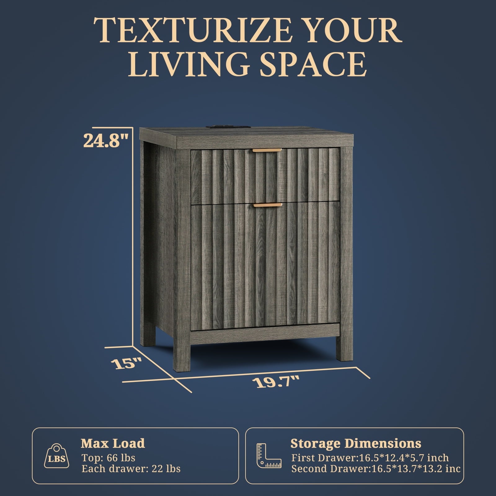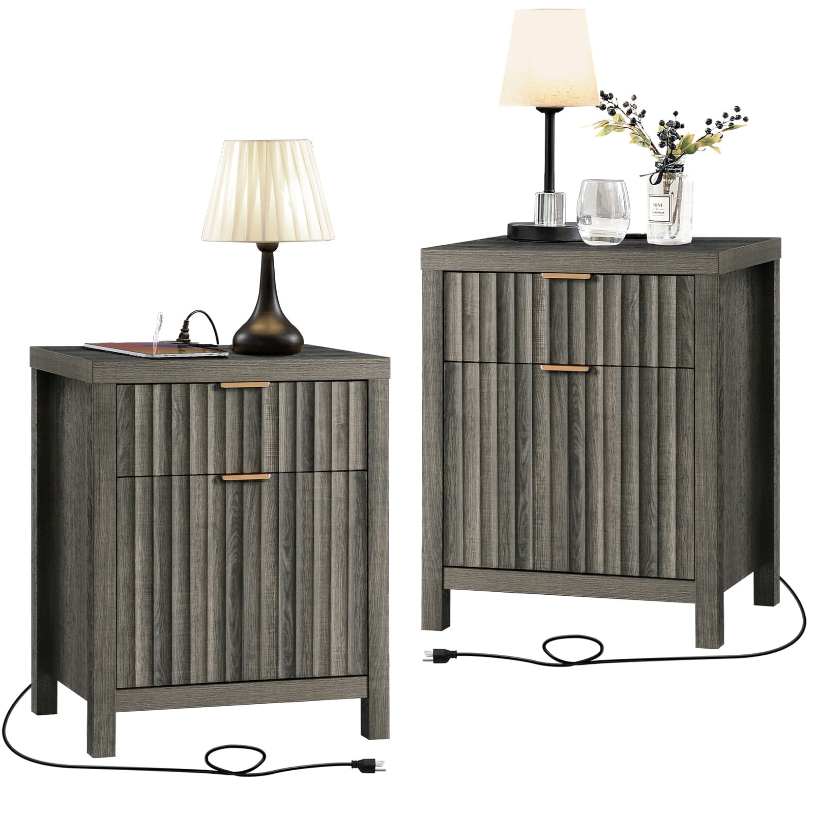 Upgrade your bedroom experience with the OAKHAM Charging Nightstand for bedroom set of 2. Equipped with 1 Type-C port, 1 USB port, 2 AC outlets, and a 4.9-foot power cord, this night stand can meet all your charging needs. The bedside table is designed with two spacious drawers to provide different storage needs. With a fluted panel and oak grain finish design, this wooden nightstand combines natural elegance with fashion, blending modern and country styles. Measuring 15.4\