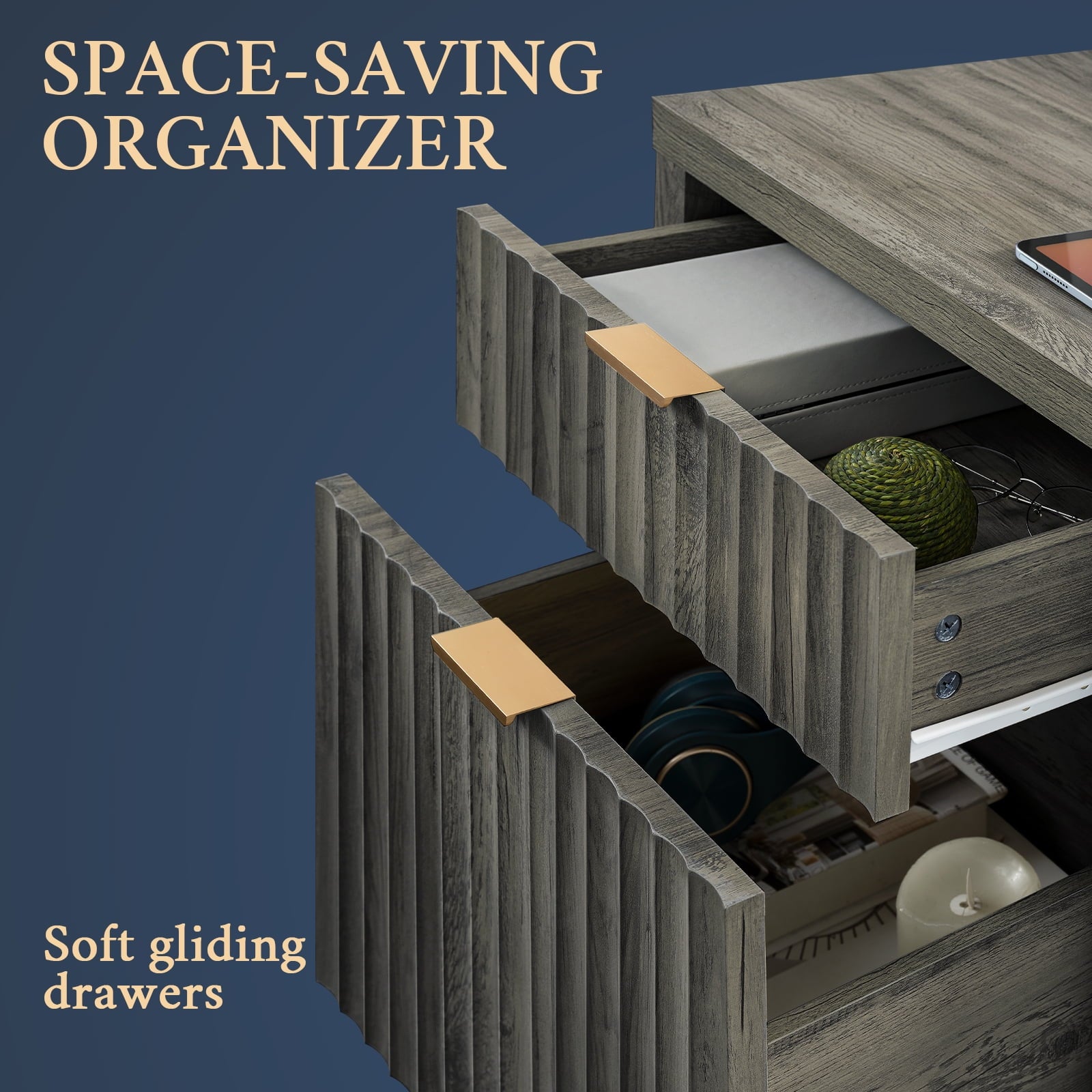 - Drawing from the fluid beauty of nature, the Wave Panel design captures the gentle yet powerful rhythm of natural elements. Complemented by durable rose gold aluminum handles, this nightstand combines nature's grace and lasting strength, offering an enduring and exquisite addition to any space.