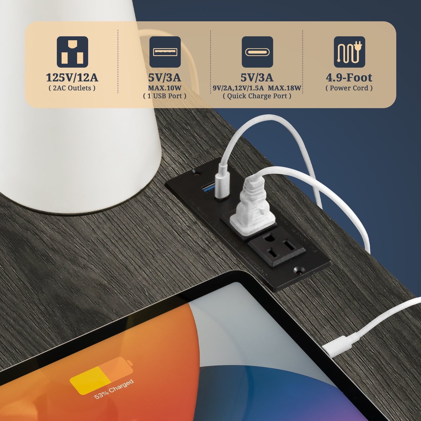 - Maintain the power of your essential devices and have them at your fingertips with our practical coffee table equipped with a built-in charging station. With 2 USB ports and 2 outlets, it allows you to effortlessly charge multiple devices simultaneously. The 4.9ft power cord provides the flexibility to position the charging nightstand wherever you desire in your bedroom or living room.