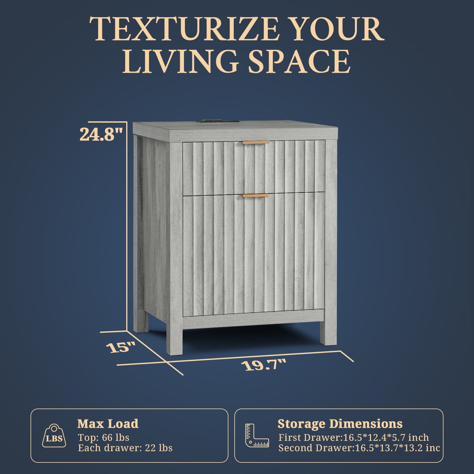- Designed with two drawers, our nightstands provides ample storage and display space, catering to your diverse needs. Whether in your bedroom or living room, it's a versatile addition that complements your space and offers the functionality you desire.