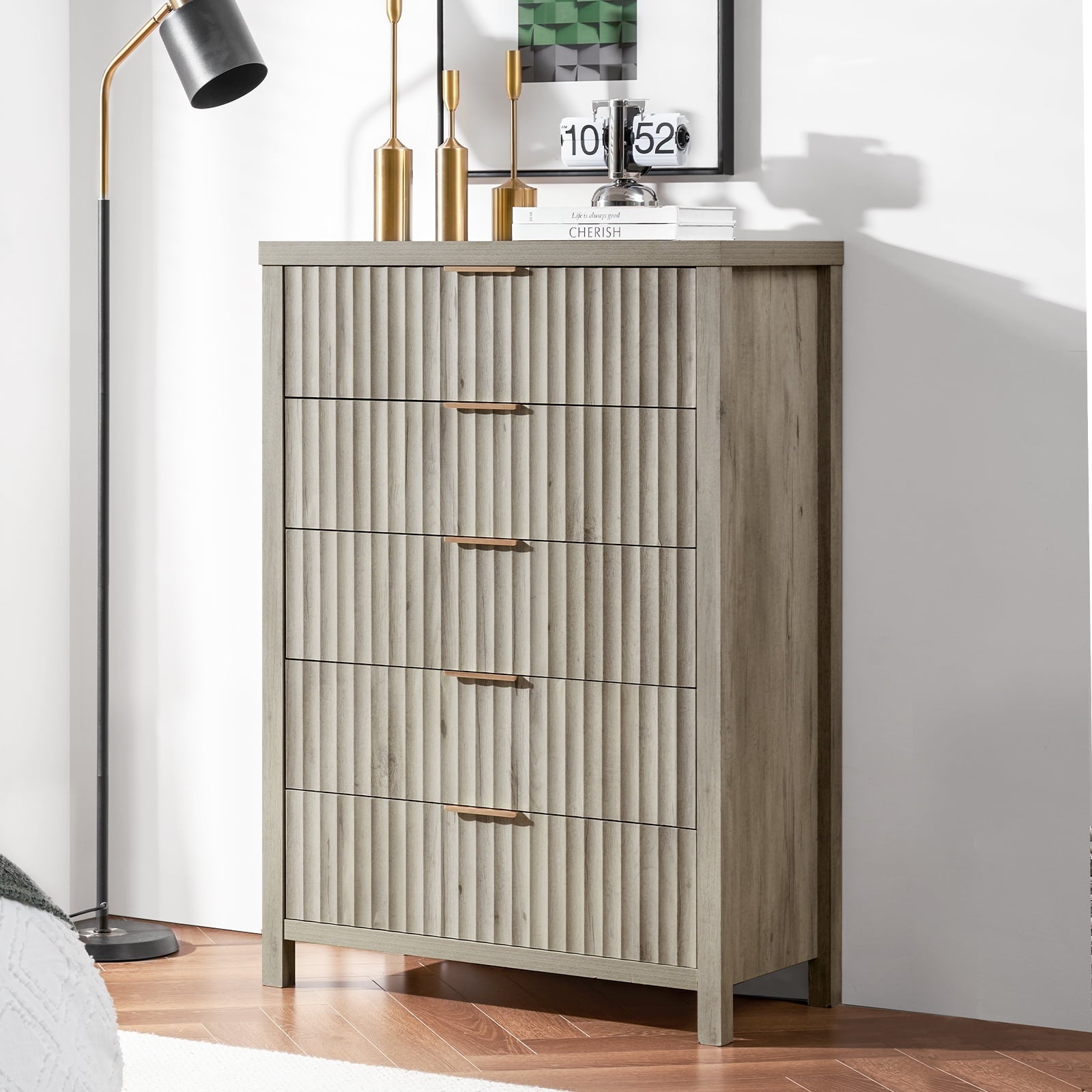 - Elegant Modern Design: This 5-drawer chest showcases a striking fluted panel design that adds a unique architectural element to your space. The sleek aluminum handles offer a modern contrast to the wood texture, making this dresser a focal point in any room.