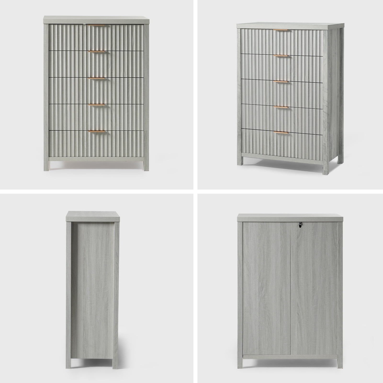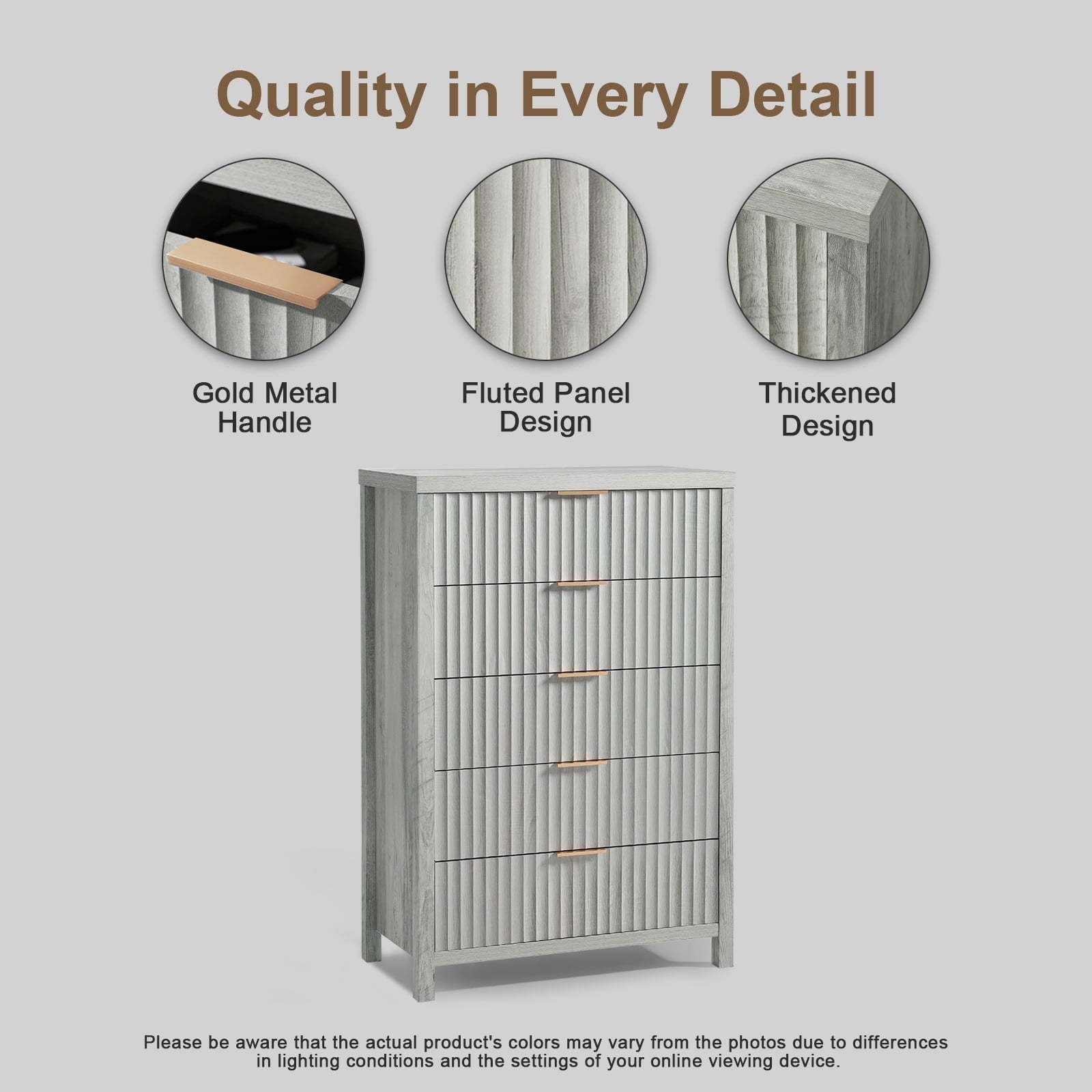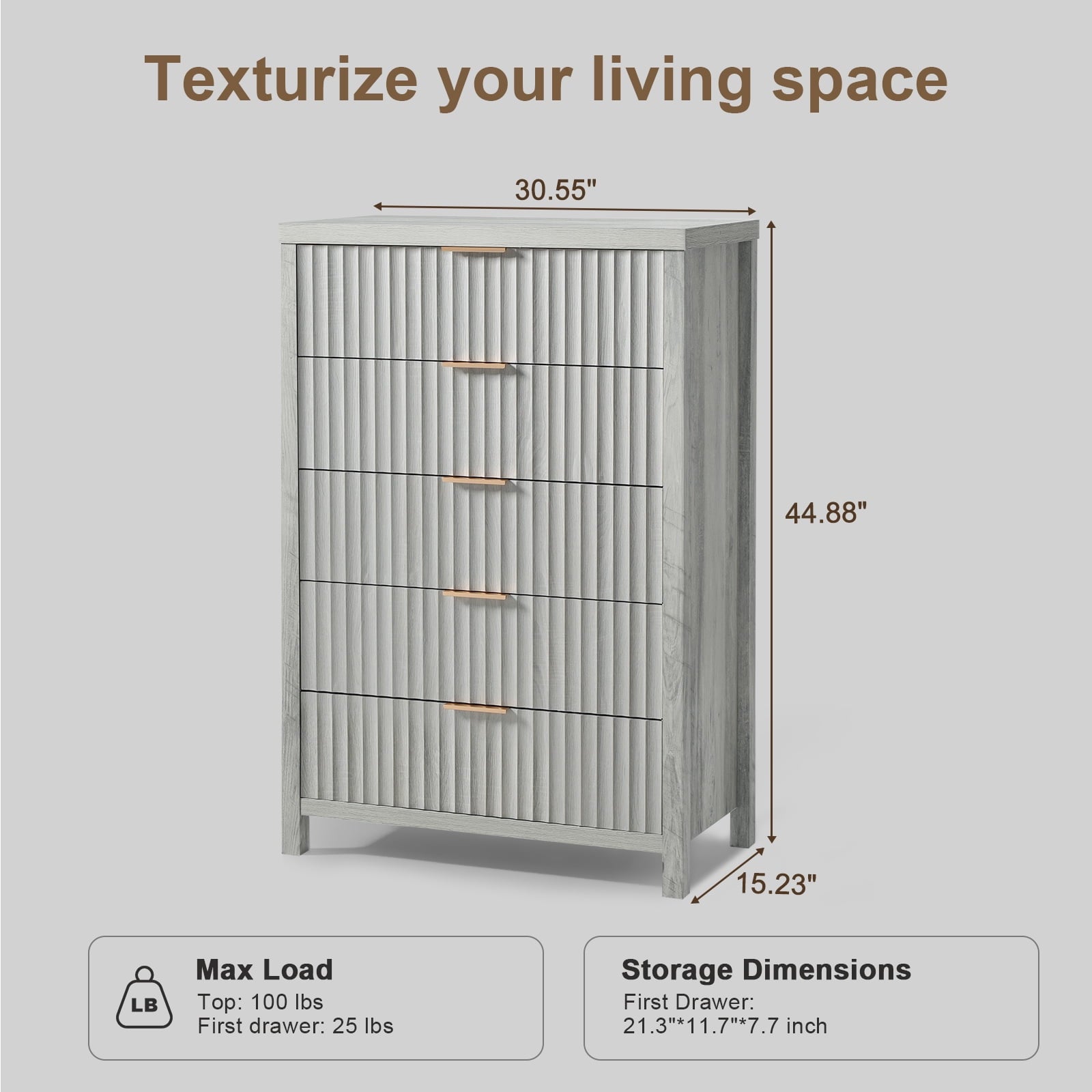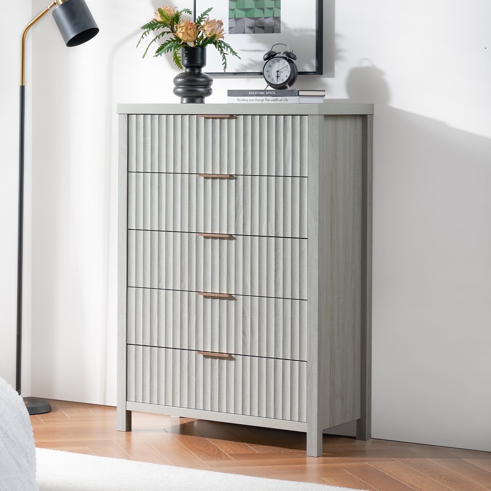 - Elegant Modern Design: This 5-drawer chest showcases a striking fluted panel design that adds a unique architectural element to your space. The sleek aluminum handles offer a modern contrast to the wood texture, making this dresser a focal point in any room.