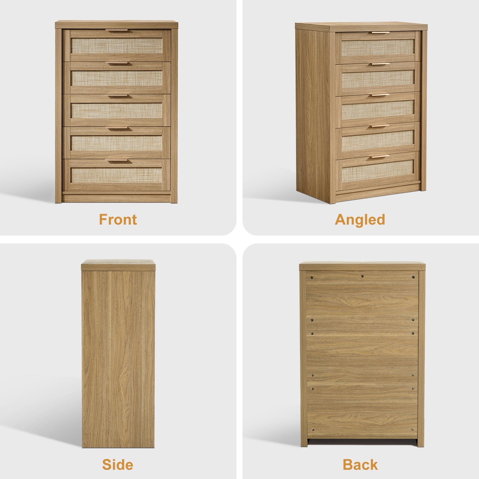 Elevate your bedroom or living room with OAKHAM 5 Drawer Rattan Dresser. Crafted from sturdy 1.4-inch thick engineered wood, our wood dresser can hold up to 110 pounds. Measuring at 15.4" L x 26.4" W x 38.9" H, this wide dresser offers ample storage space with 5 drawers, making it the perfect chest of drawers for organizing essentials. Its design seamlessly blends functionality with style, serving as both a wide dresser and a storage cabinet. The golden handles and smooth metal glides ensure easy operation, while the rattan drawers add a touch of Bohemian flair to any room. Keep your home tidy and stylish with this boho dresser, providing stylish and functional storage solutions for any space.