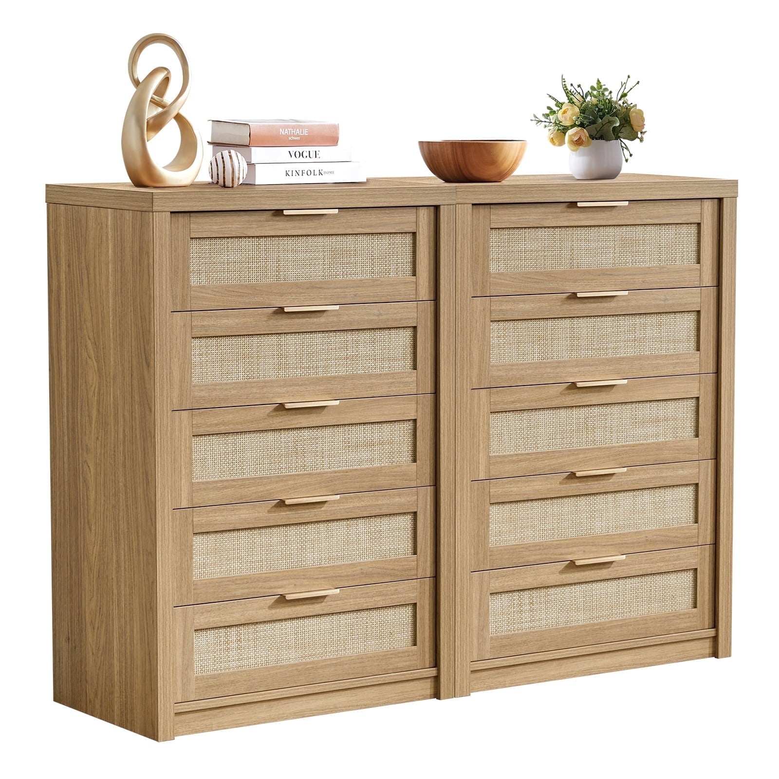 OAKHAM 5 Drawer Dresser, Rattan Wide Chest of Drawers for Bedroom Living Room, Set of 2, Weathered Oak