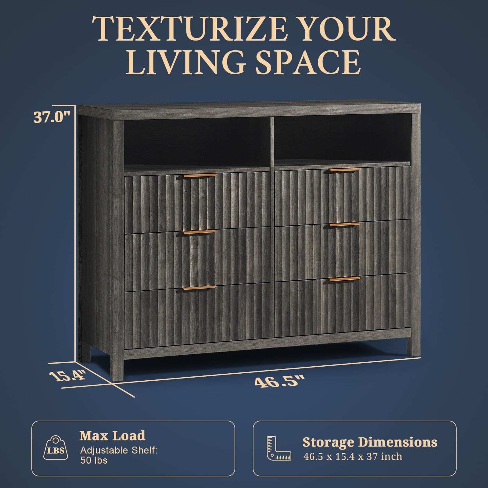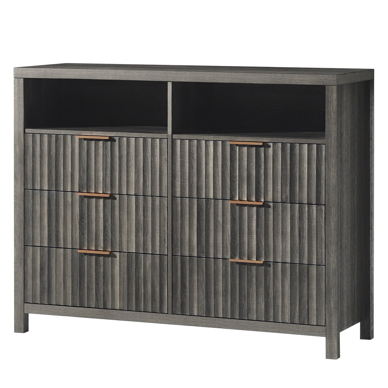 Upgrade your home with our Fluted 6-Drawer Dresser with Open Shelving, combining modern design with practical storage. This dresser features textured fluted doors, sleek aluminum handles, and two open shelves, providing a stylish and functional solution for organizing your space. Whether you're looking for a dresser for your bedroom, a storage solution for your living room, or a versatile piece for your hallway, this dresser is designed to meet your needs with elegance and efficiency.