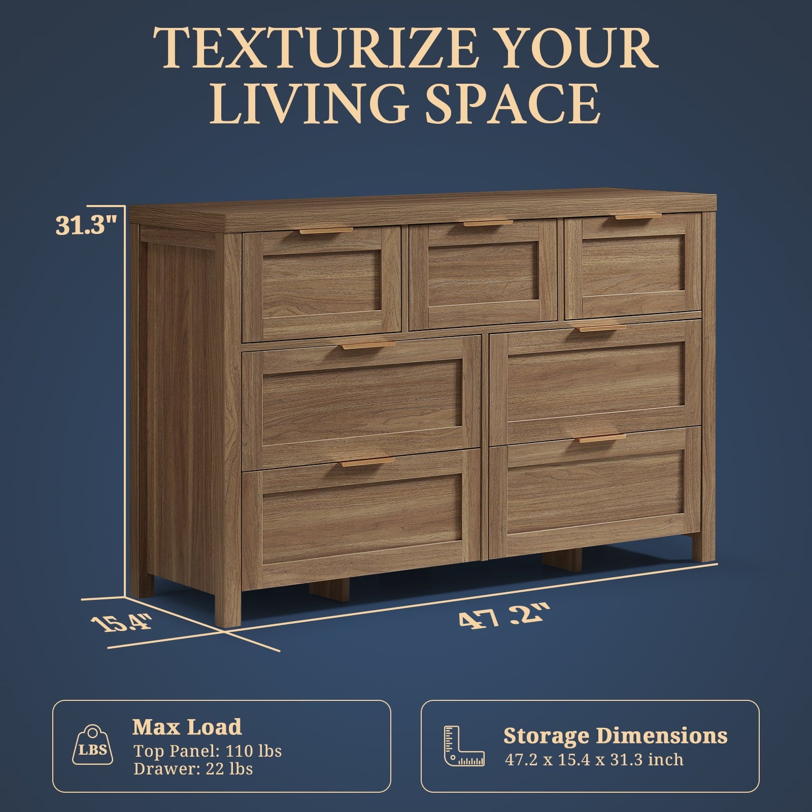- 7 Spacious Drawers: Featuring seven quiet, smooth-gliding drawers, each designed to offer ample storage space for clothing, bedding, or other essentials. This dresser ensures a clutter-free bedroom, living room, closet, or hallway, with dimensions that make it both functional and compact: 31.3" H x 47.2" W x 15.4" D.