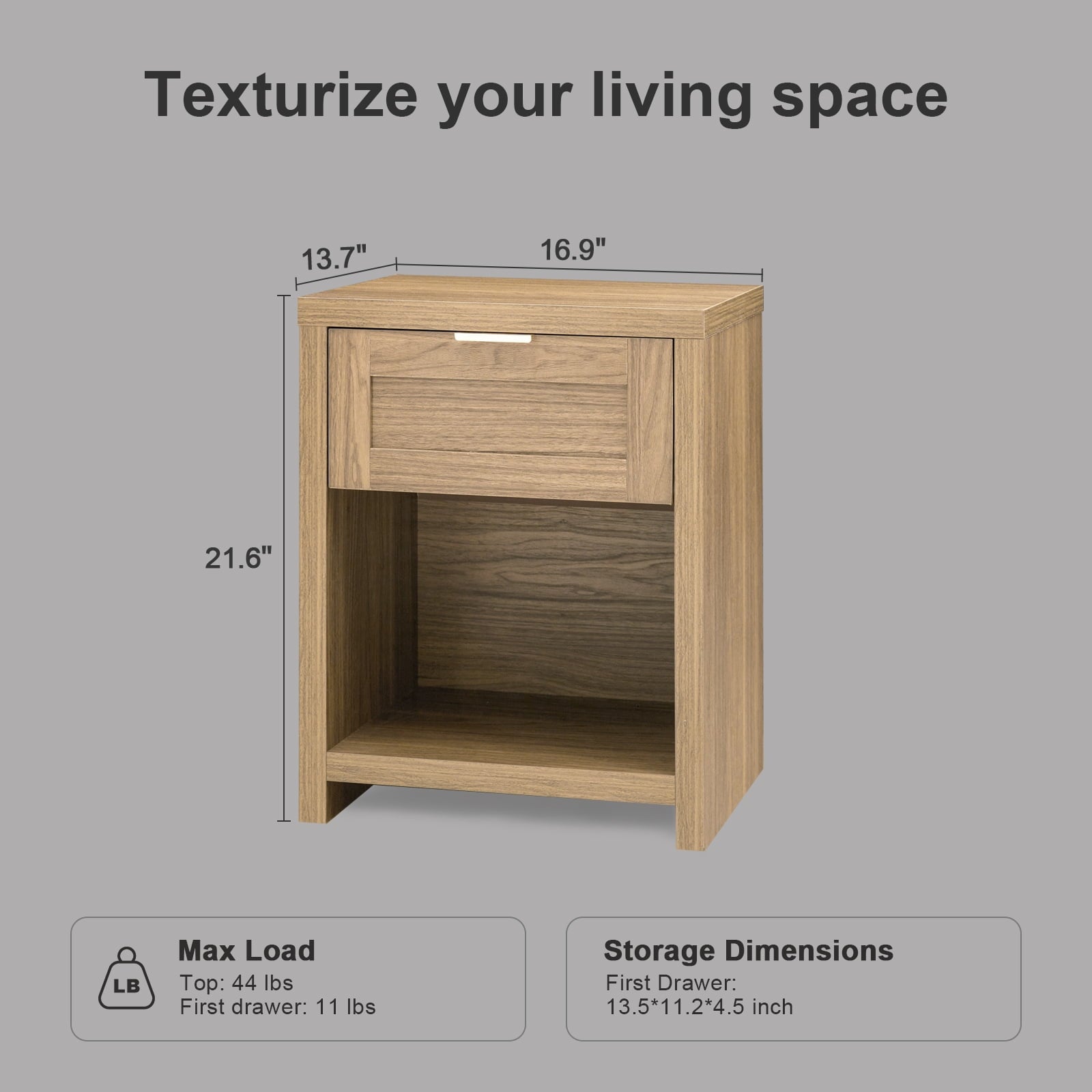- Size: 16.9"(L) x 13.7"(D) x 21.6"(H). Our bedroom furniture set comes with detailed instruction video, ensuring a swift and hassle-free setup. Our nightstand comes with step-by-step instructions, which is illustrated with parts. bed side tables bedroom set of 2 all screws and boards are labeled with letters, and screws are also thoughtfully packed in different small bags to prevent loss. These details are designed to help you assemble it more quickly.