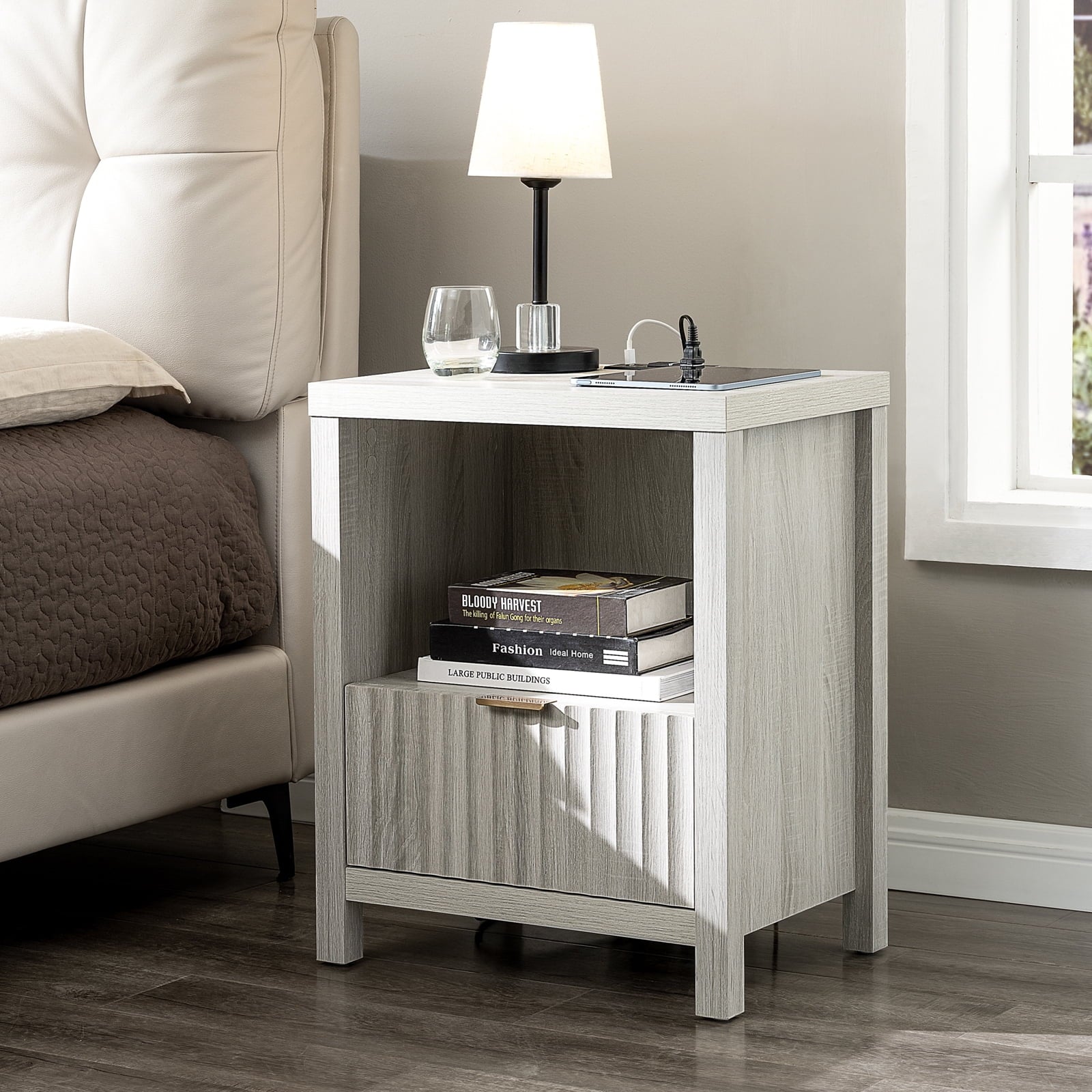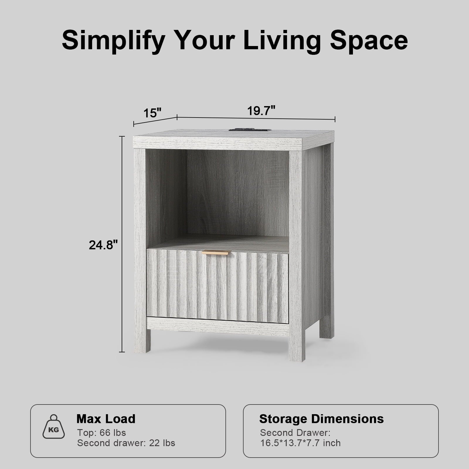 Upgrade your bedroom experience with the OAKHAM Charging Nightstand set of 2. This bedside table combines versatile storage options with convenient charging capabilities. Featuring an open shelf and a drawer, it offers ample space to showcase your favorites and keep essentials organized. Equipped with a Type-C port, USB port, and two AC outlets adn 4.9ft power cord, it meets all your charging needs. With its fluted panel design and oak-textured veneer, this wooden night stand adds elegance to any decor. Compact yet spacious, our charging nightstand measures 15.4\