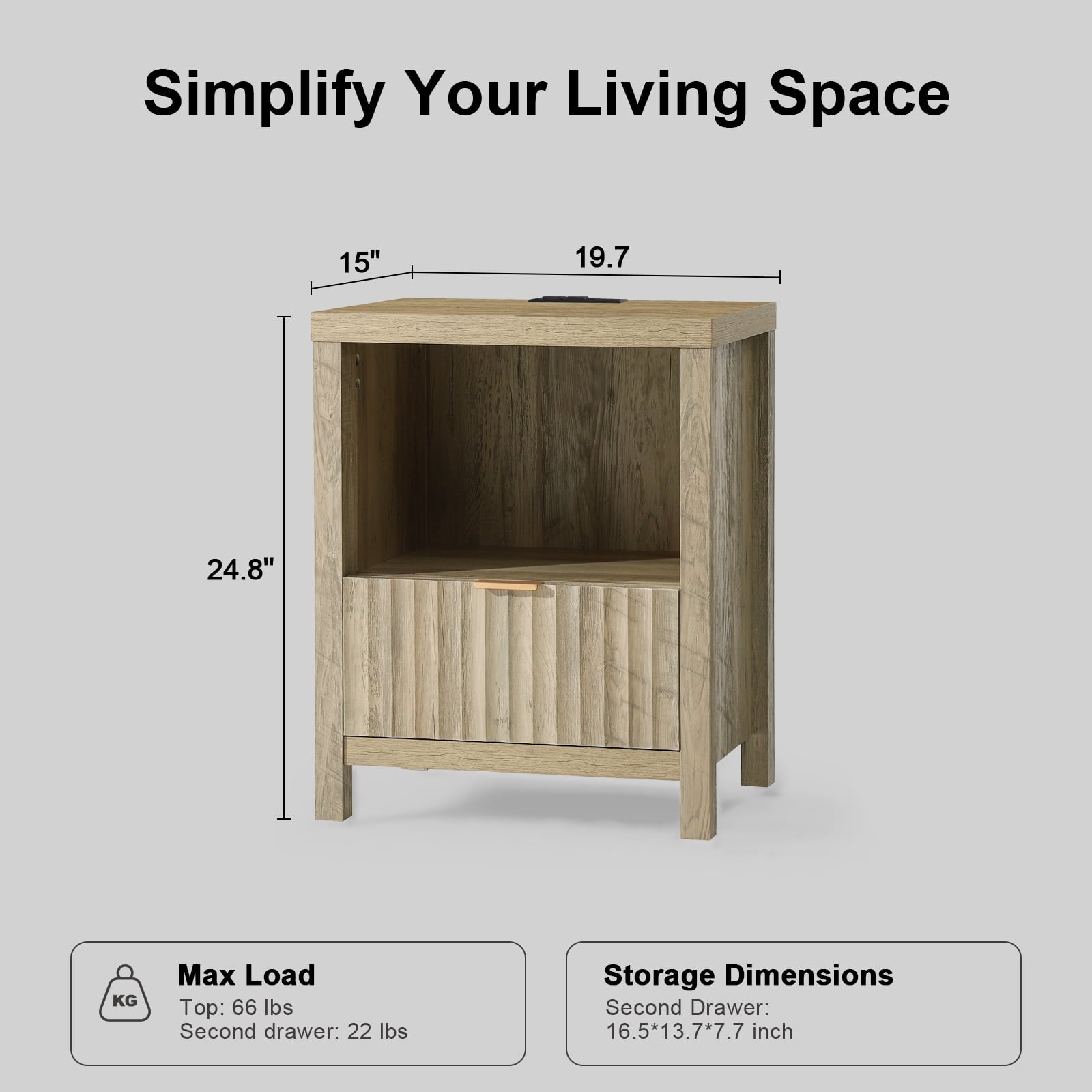 Upgrade your bedroom experience with the OAKAHM Nightstand with Charging station. This bedside table combines versatile storage options with convenient charging capabilities. Featuring an open shelf and a drawer, it offers ample space to showcase your favorites and keep essentials organized. Equipped with a Type-C port, USB port, and two AC outlets adn 4.9ft power cord, it meets all your charging needs. With its fluted panel design and oak-textured veneer, this wooden night stand adds elegance to any decor. Compact yet spacious, our charging nightstand measures 15.4\
