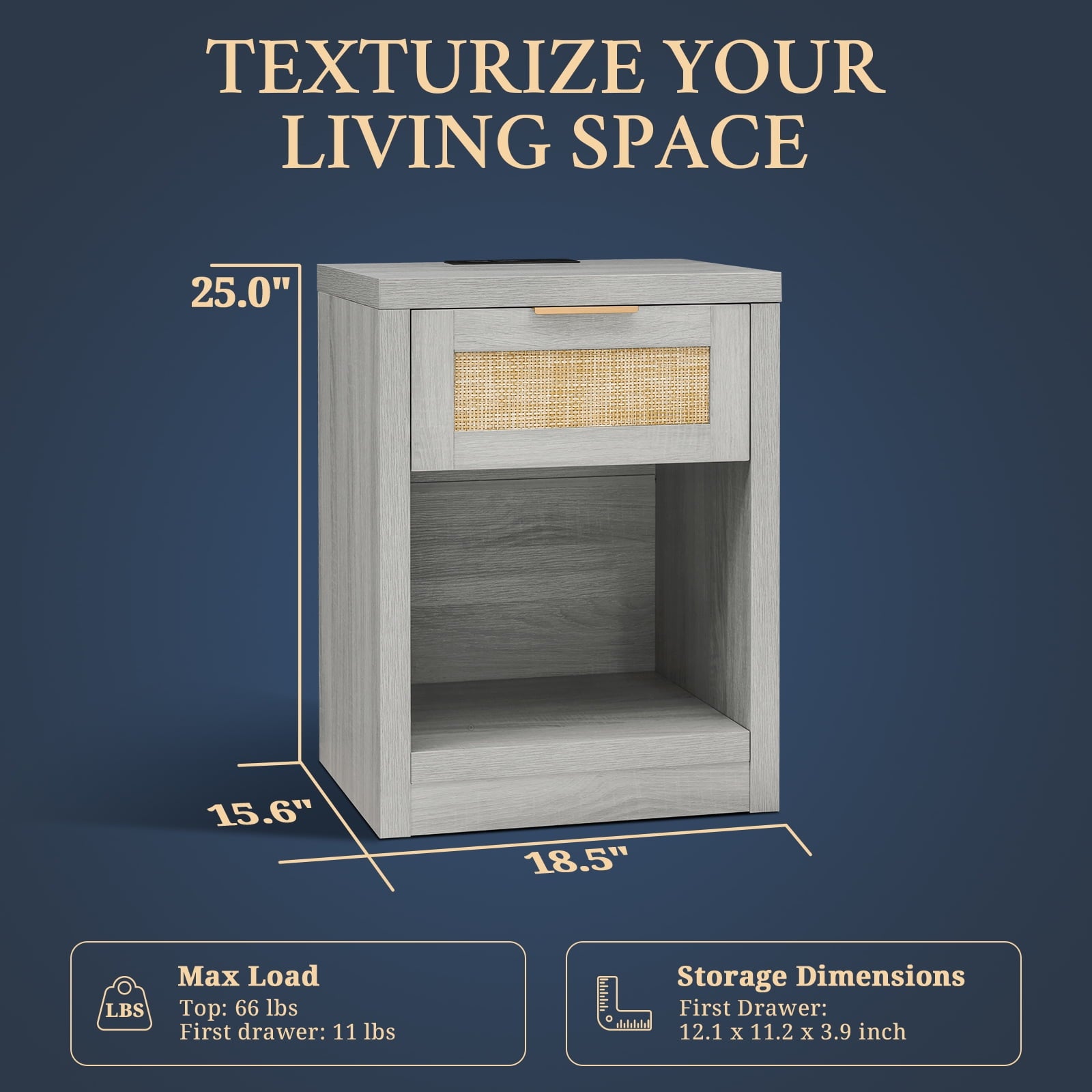 - The rattan bedside table is equipped with 2 power sockets, 1 Type-C port, and 1 USB port to fully meet your charging needs. The charging ports are conveniently located above the table, making it easy for you to use desk lamps, mobile phones, and other devices. Please note: The nightstand's height is 25 inches. Confirm if it fits your room before making a purchase.