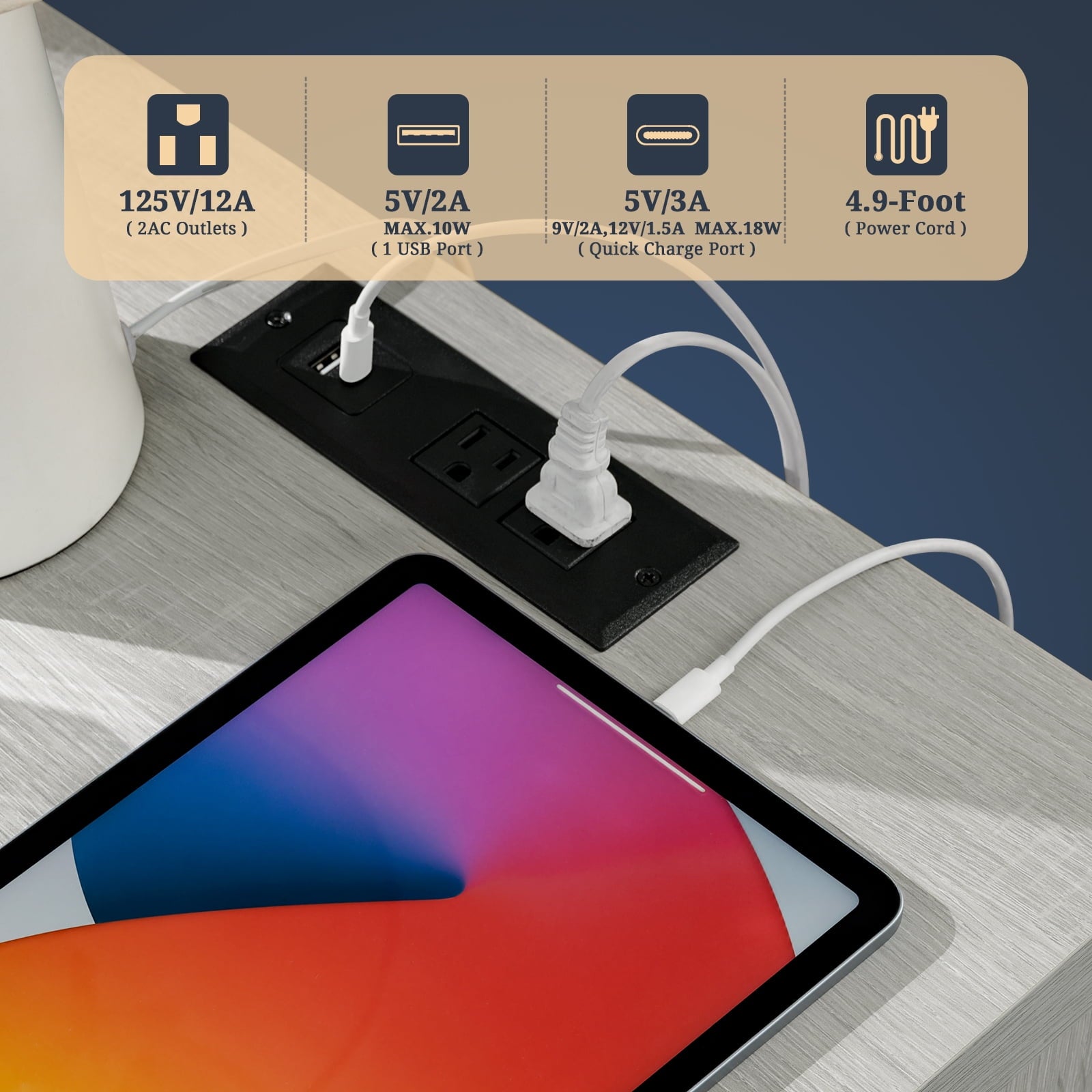 This bedside table with charging station has 1 Type-c and USB port and two AC outlets, providing a convenient charging solution for your mobile phone, tablet, computer and desk lamp.