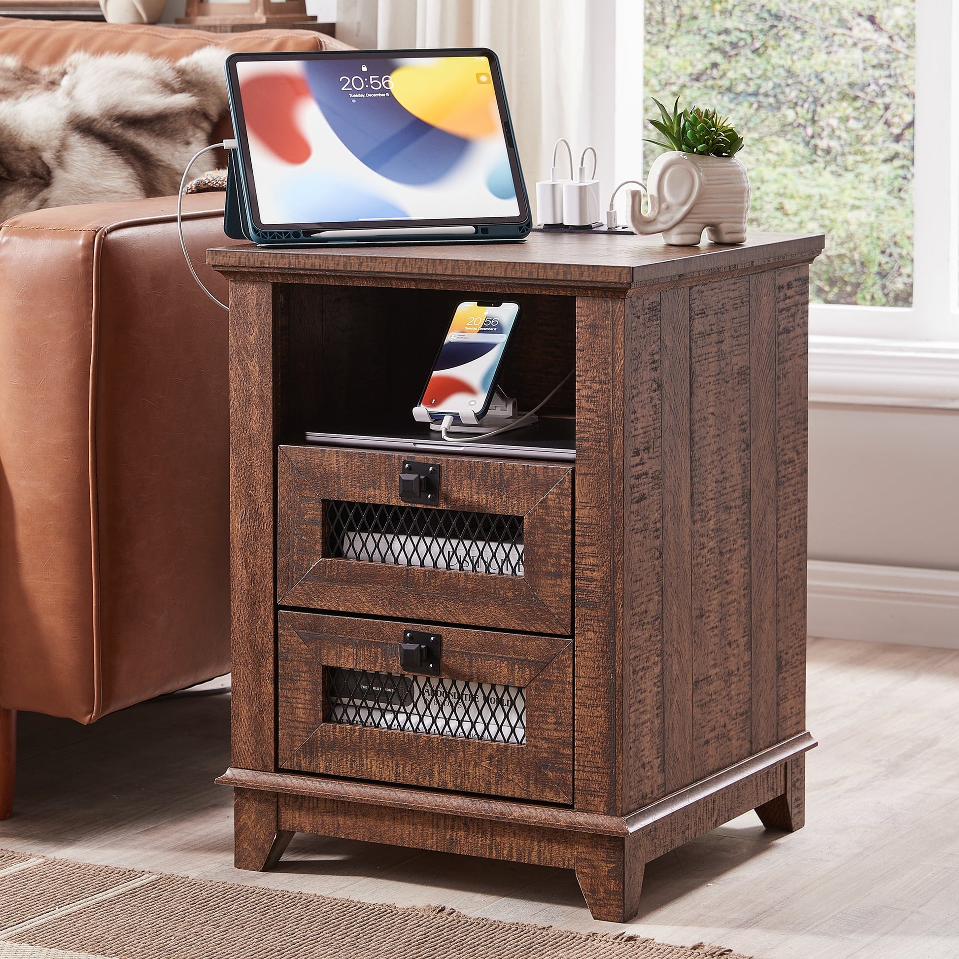It features a rustic & industrial combination of beauty and functionality ensue with the OKD square nightstand. Its farmhouse style attention with a distressed rustic finish and dark iron-tone metal accents. You'll love the extra room in the cubby and 2 drawers for stashing items within arm's length. What's more, a convenient UL-listed AC power supply with 2 standard AC outlets and 2 USB ports which is located at the top panel¡ªperfect for keeping your cell phone or laptop charged without getting up from your seat/bed. Upper open cubby with 2.3'' cord management port to keep your cables organized. The white with a modern look sofa table adds vertical storage to a tight space and bring a neat and elegant feel to your living room. MULTI-PURPOSE TABLE: Equipped with 2 smooth-gliding 2 drawers and strong powder-coated metal pulls to get your essentials easily. Upper open cubby for books and larger items. This nightstand can be used as an end table in the living room, as office supplies storage in the office, or placed inside the closet to create extra storage. DURABLE & STABLE:Constructed from ultra-durable MDF, engineered wood, and coated metal pull. Crafted with 2" x 2" engineered wood frame and 1.18" thick tabletop with max load of 50 lbs ensuring excellent durability and stability. It can be used for a long time without replacement. DUST PROOF: The painted surface is easy to clean and waterproof. Moreover,there is no unpleasant smell. EASY ASSEMBLY: Just simply follow the illustration for each step to find the identically marked parts or hardware and assemble them together, repeat these two simple steps, you can easy to get this tv console in 30-40 minutes. (2 Adults are recommended to assemble) SERVICE & PACKAGE: Your nightstand will be in a very secure box that contains foam and wood protective boards surrounding it, this provides maximum protection against shipping damage to your products to avoid unnecessary trouble.