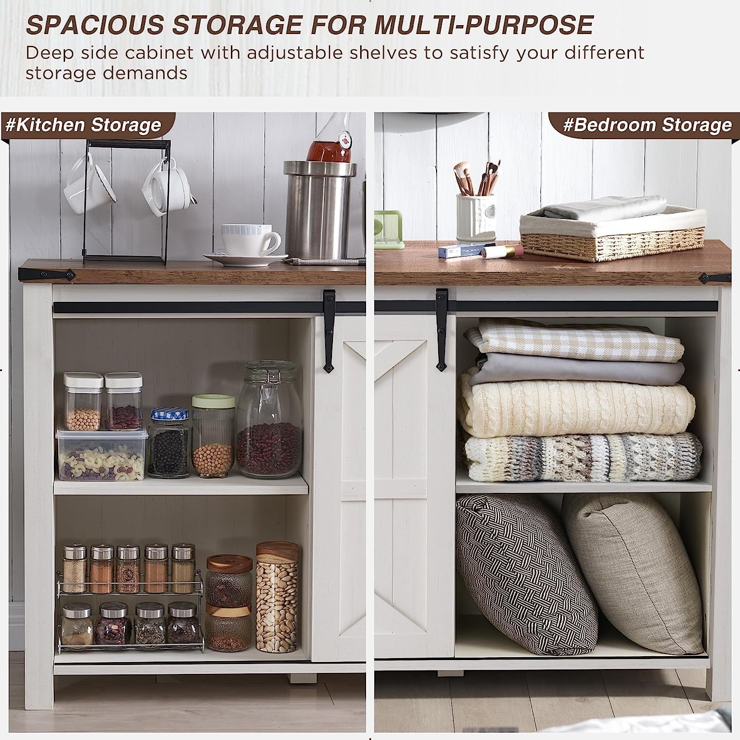 [SLIDING BARN DOORS]: The farmhouse space-saving barn door slides open on a metal track to reveal adjustable shelf space, allowing you to freely hide or show storage spaces.