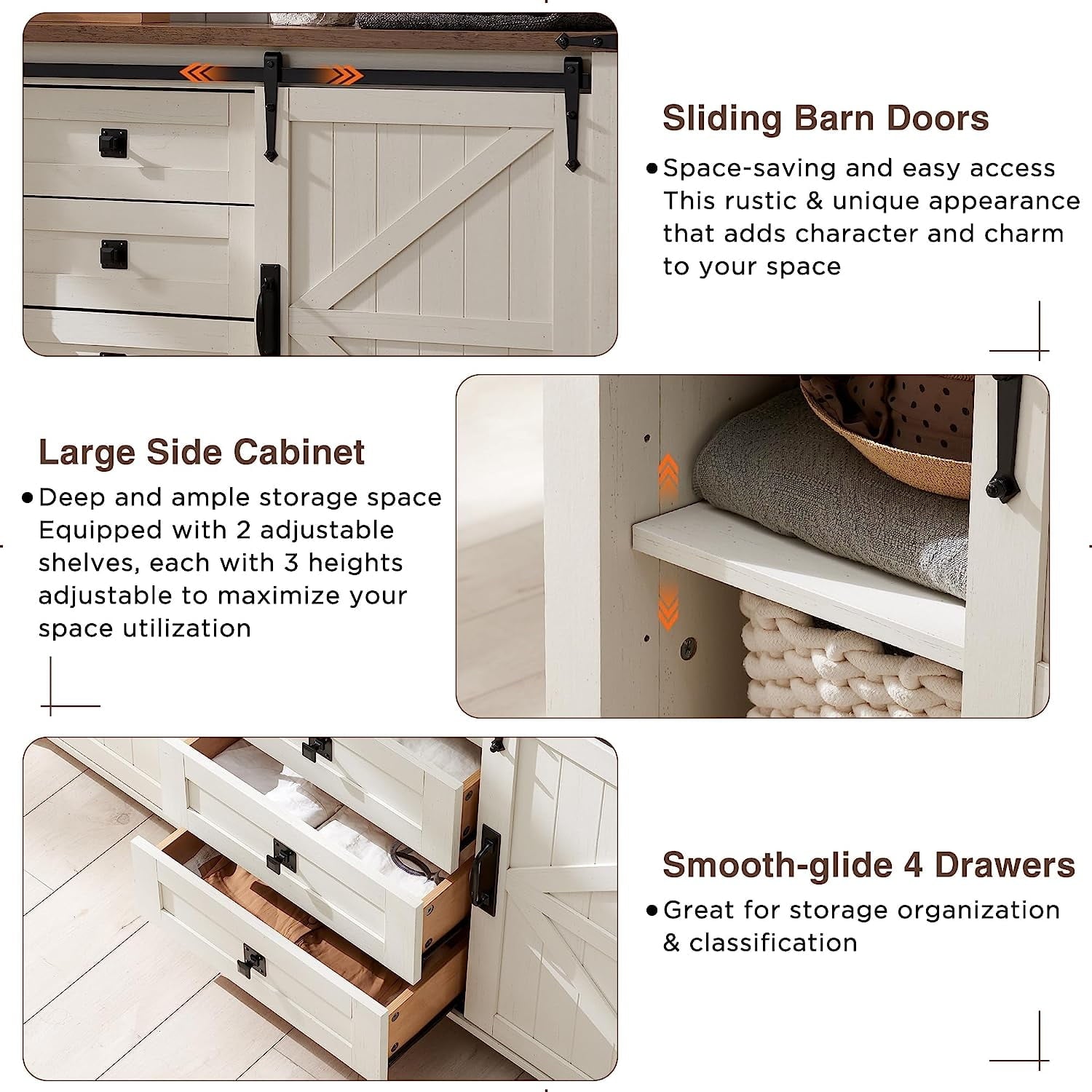 - [4 LARGE DRAWERS]: It features 4 drawers with a width of 16.2 inches drawer size: 16.2''W * 12''D * 4.1''H, and 2 space-saving sliding barn doors with 2 adjustable shelves.