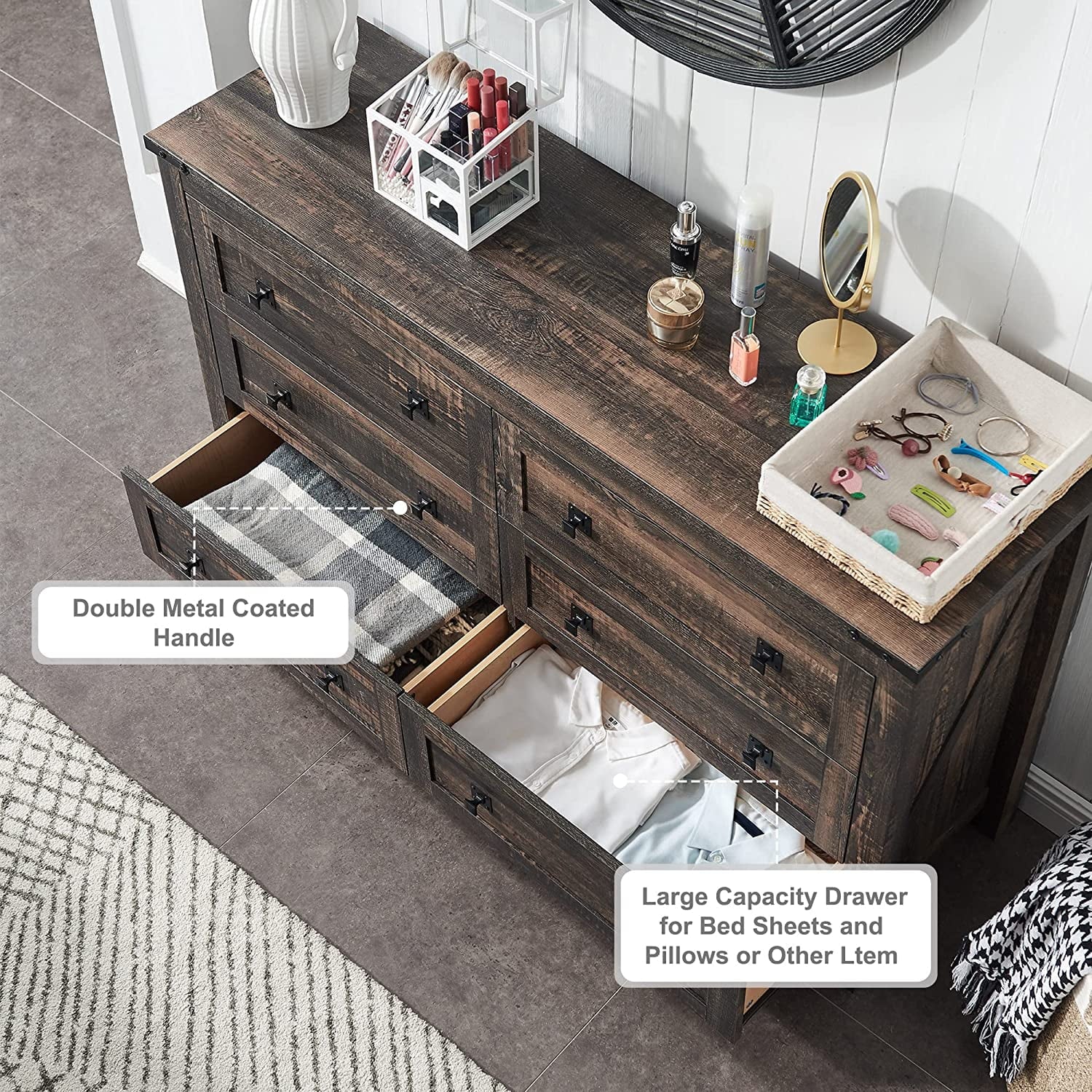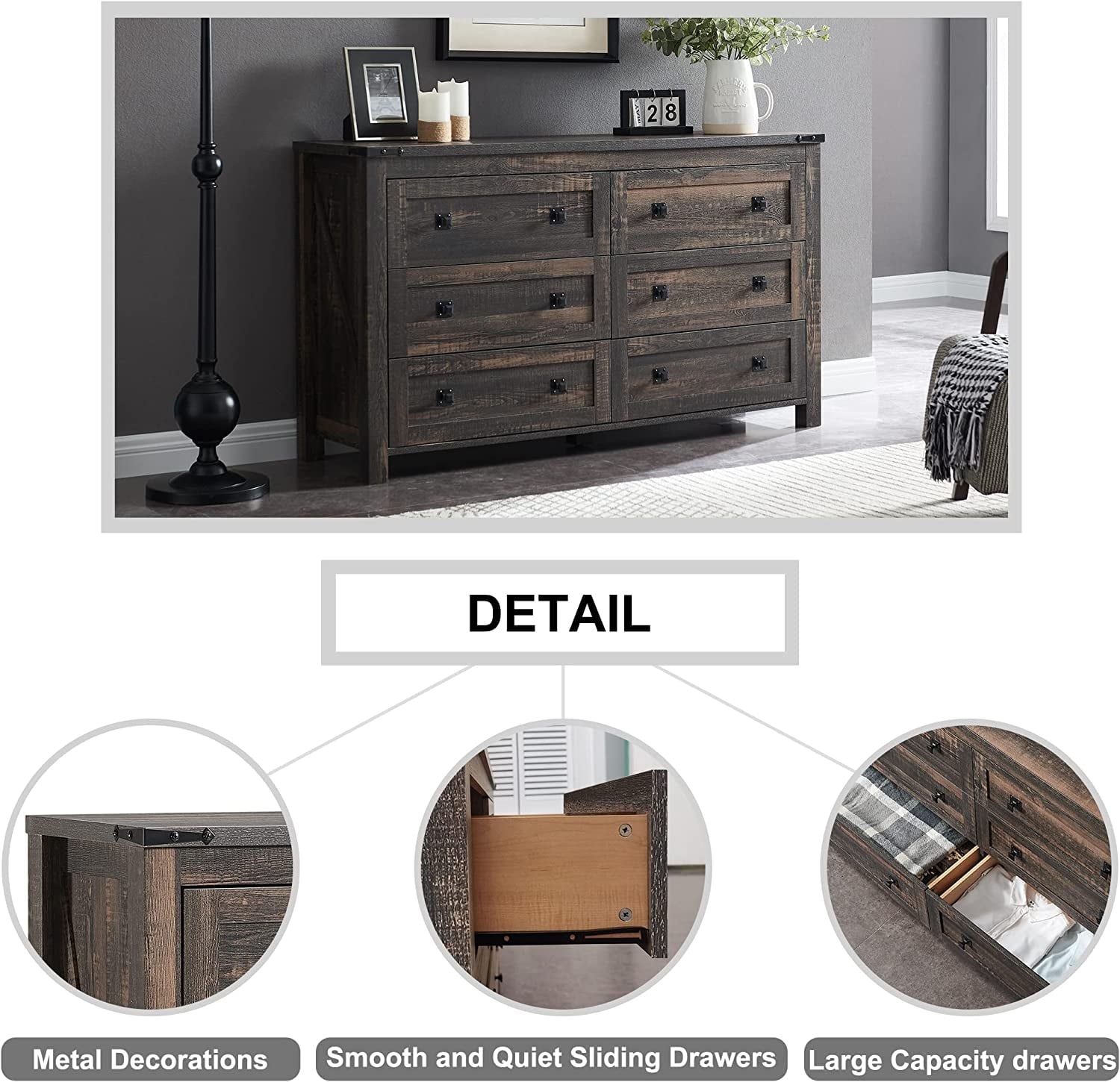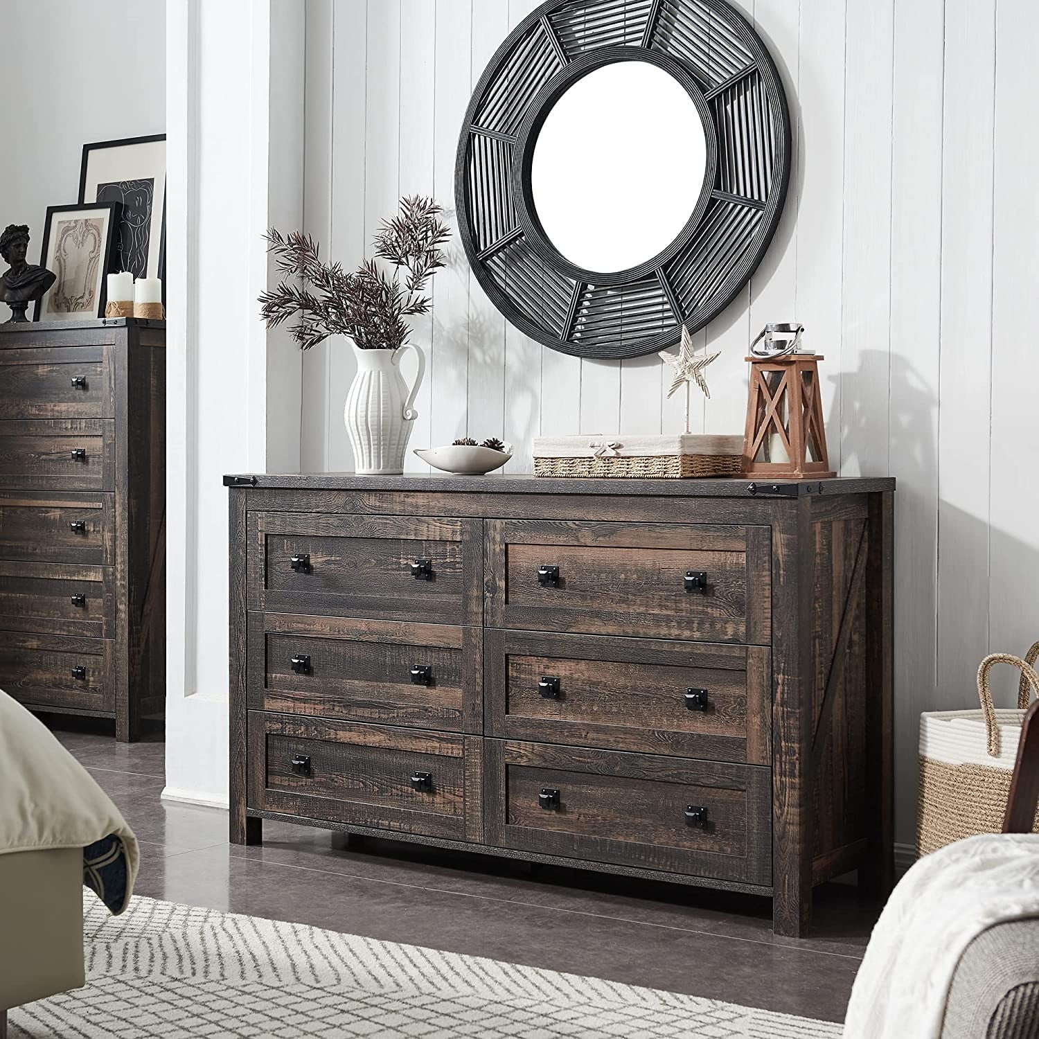 - Rustic wooden 6 drawer dresser with barn door style and spacious design is a perfect combination of modern and farmhouse style, adding character and charm to your bedroom and living room. Can be used for clothing organizer/lingerie dresser,entryway table, accent storage cabinet for living room.