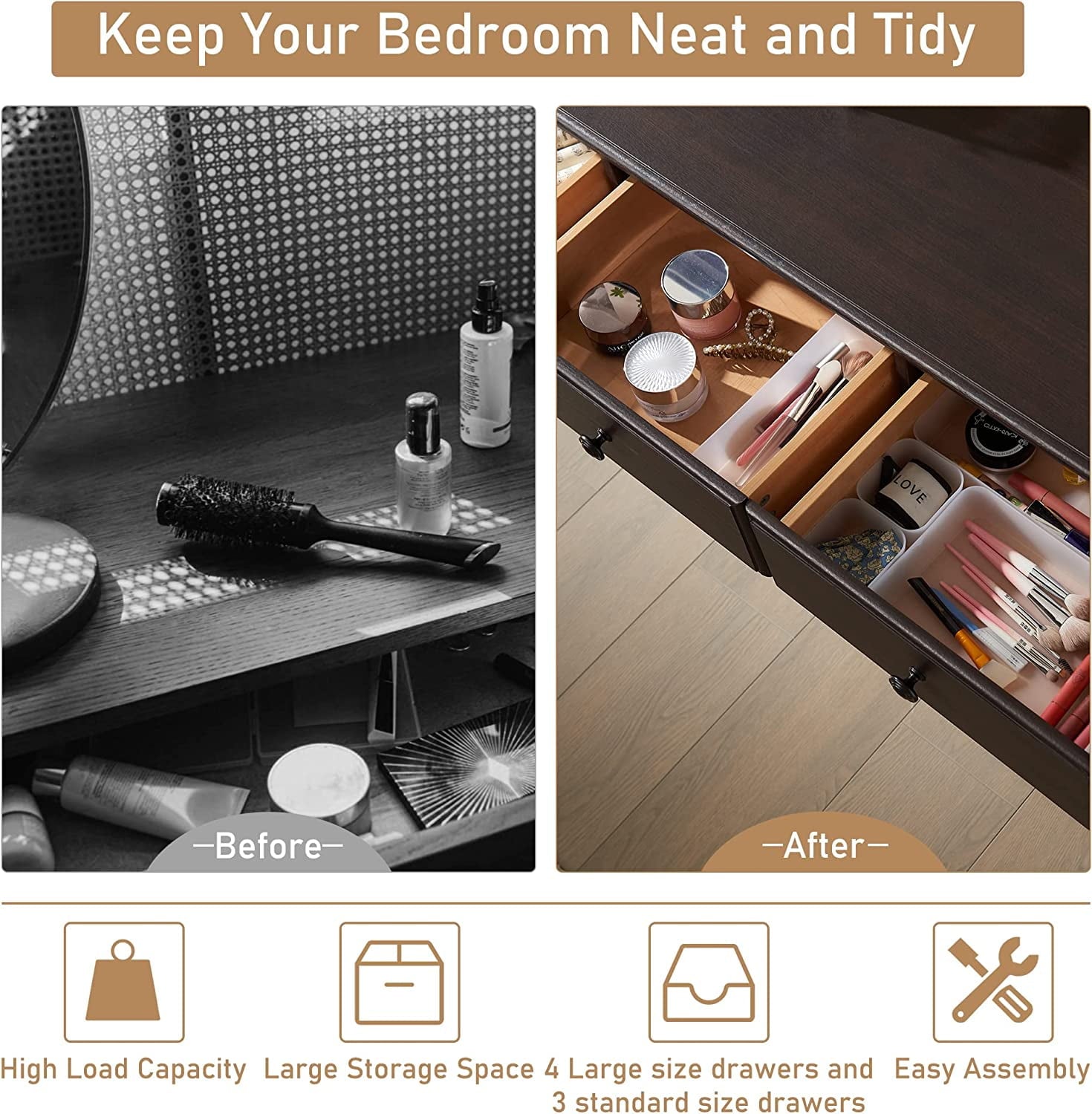 - This drawer dresser comes with 2 sizes of drawers, providing as much storage space as possible for different items.