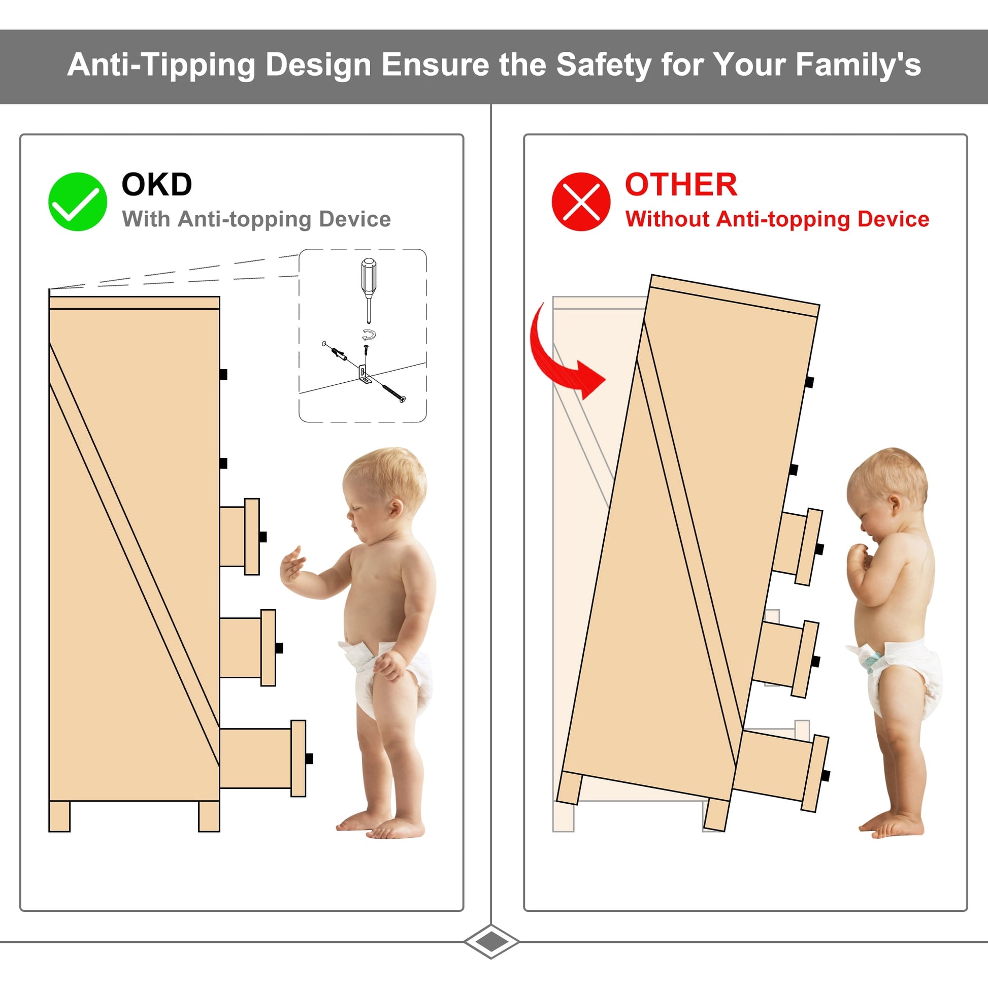The OKD Farmhouse 8 Drawers Dresser Storage Cabinet for Bedroom is made of durable engineered wood for long term use, scratch resistant. No strong odor. The widened 2"*2" dresser legs made the dresser does not slide easily, provide great durability and stability. With a support leg in the middle for added weight support. Can be used for TV Stand for 60" TV/clothing organizer/lingerie dresser,entryway table, accent storage cabinet for living room.