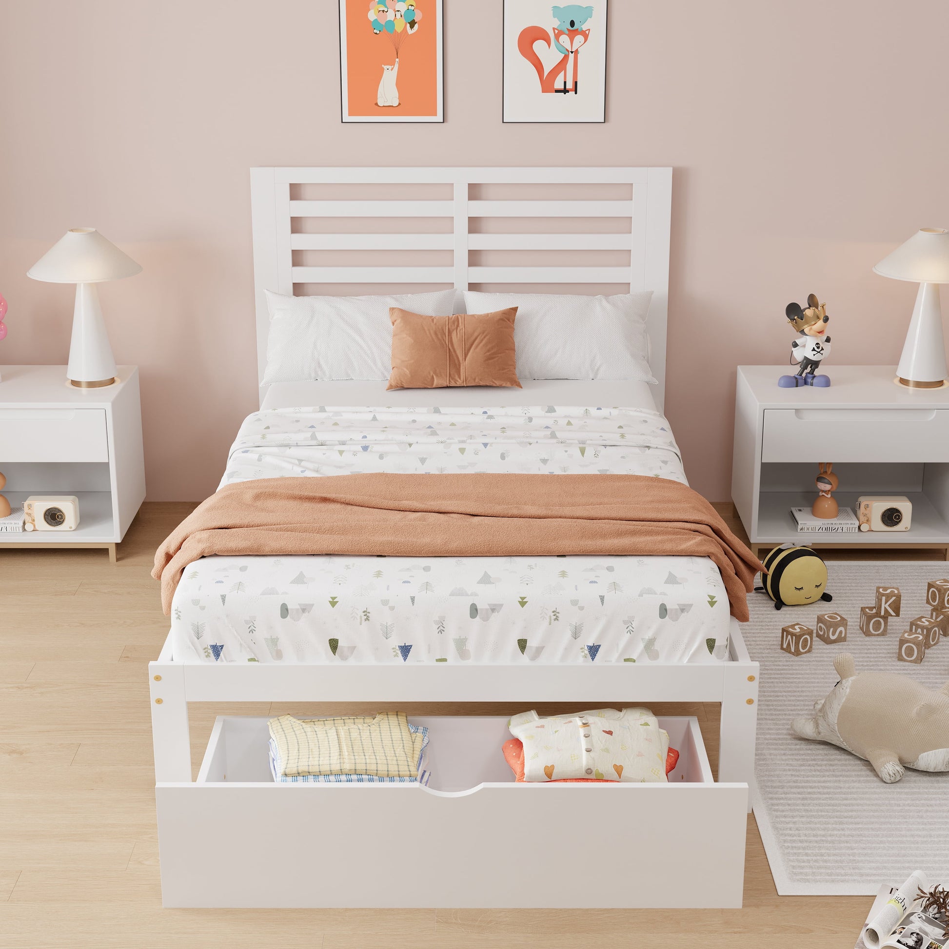 UHOMEPRO wood storage platform bed with headboard and drawers is a minimalistic, stylish bed base that works well with a variety of decorating styles and makes it easy for you to beautify the look of your lovely bedroom. This platform bed features a headboard and wood slats for support. White/Gray colored surface for an elegant look makes this bed frame an excellent addition to any bedroom. Accommodating a twin-sized mattress with no need for a box spring, this twin bed frame highlights a minimalist design that is ideal for small spaces living.