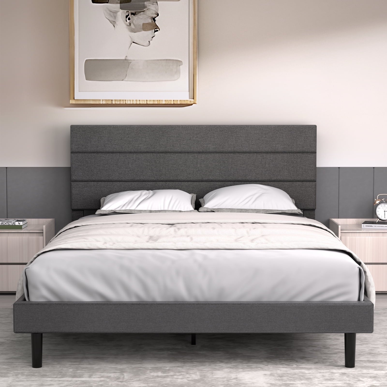 LAFGUR Queen Size Platform Bed Frame with Fabric Upholstered Headboard and Wooden Slats Support, Fully Upholstered Mattress Foundation/No Box Spring Needed/Easy Assembly, Dark Grey