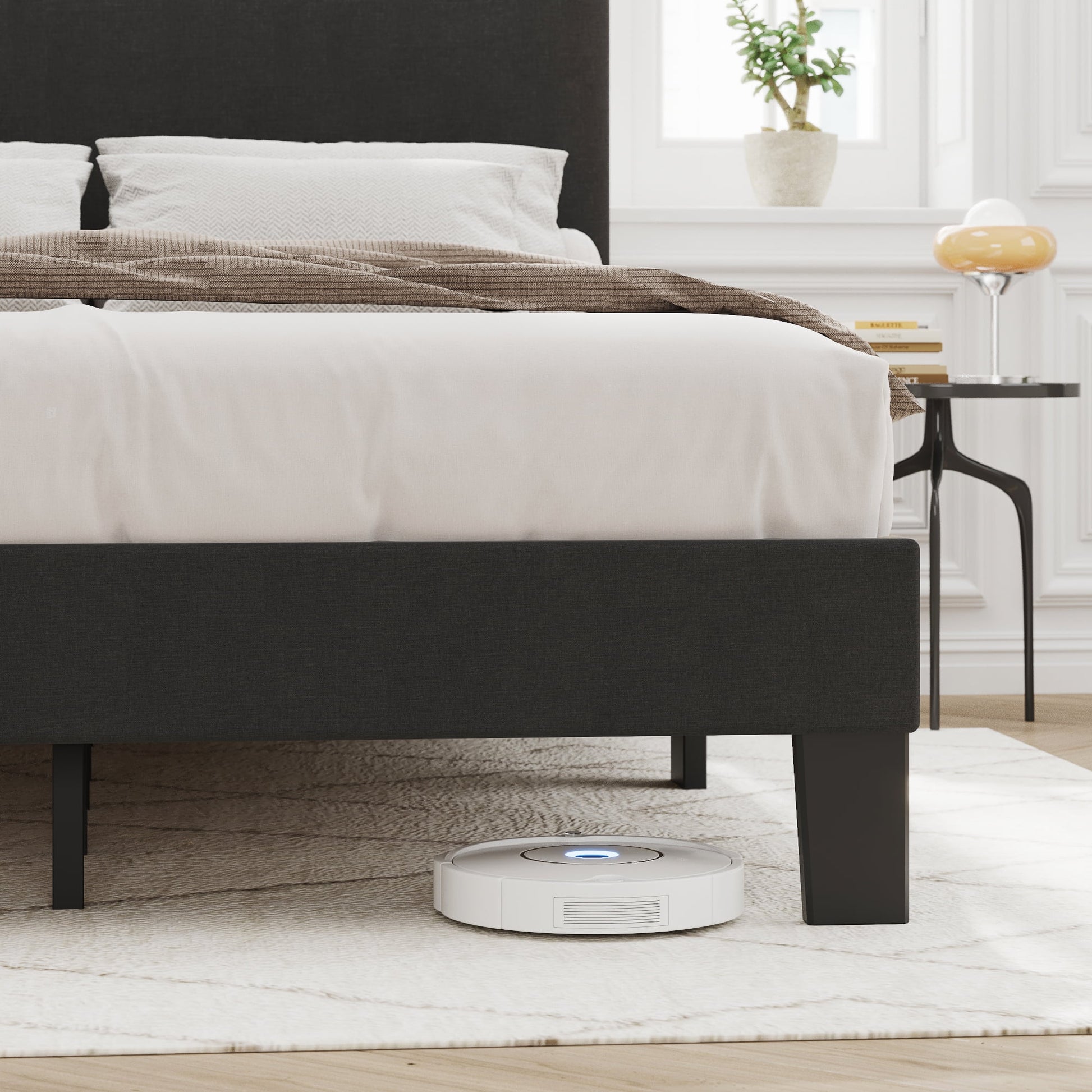 The 5.9" high foot of the bed bring you better using experience while providing you with ample of easy-to-clean under-bed storage space. ¡¤ Adjustable Headboard: Height adjustable upholstered headboard between 35 and 39 inches to accommodate mattresses of varying heights. Fits mattresses from 8 to 12 inches thick. ¡¤ Sturdy Structure: Frame is made of high-quality metal and wood, sturdy. ¡¤ Noise Free: Velcro design for each slat joint, easy to install and prevent squeaks when in use. ¡¤ No Box Spring Needed: Sturdy wood slats extend the life of your latex, memory foam or innerspring mattress without the need for a box spring. Maximum weight capacity 800 lbs.