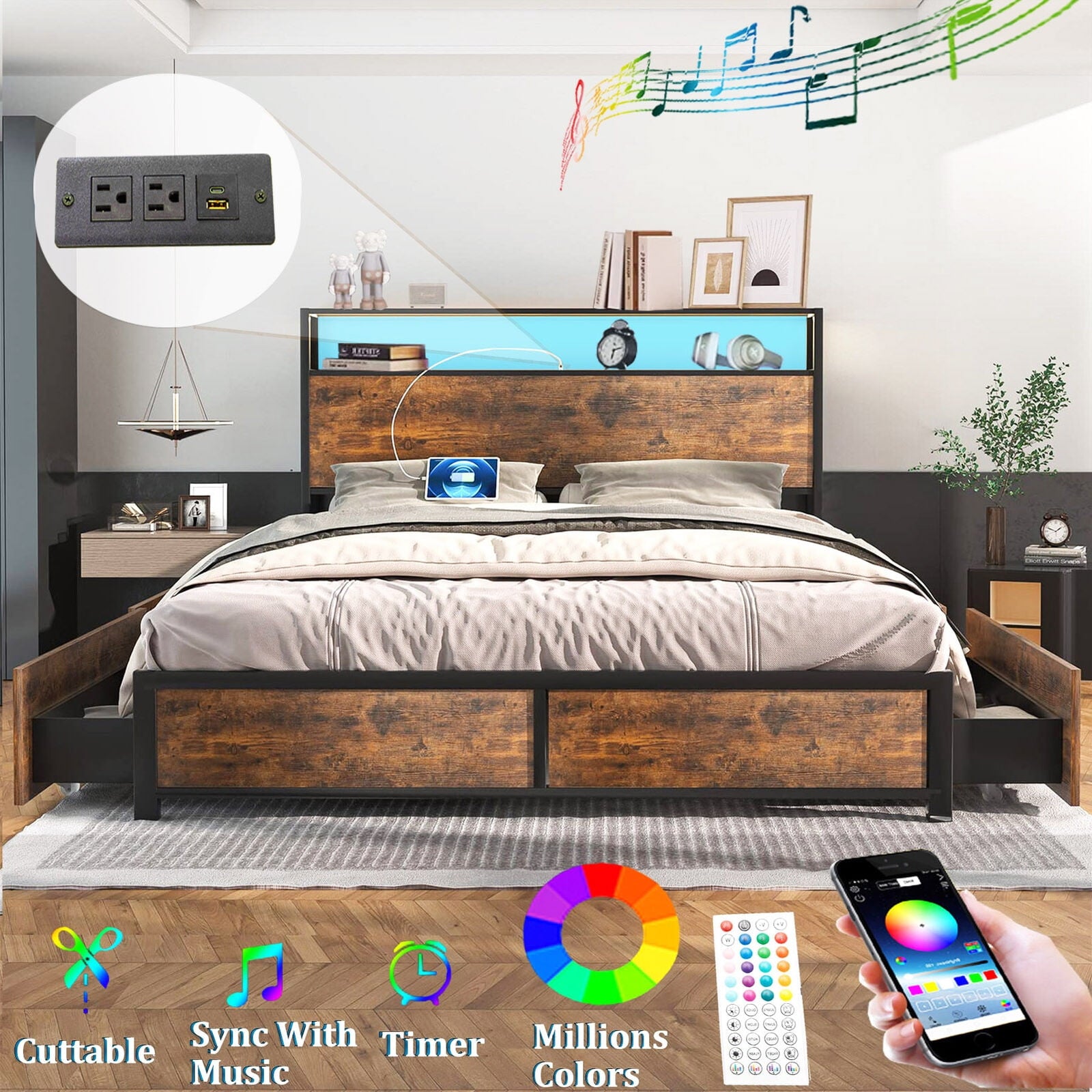 - ????Storage Headboard with Power Outlet: Our LED bedframe have 2 Tier headboard, can easily store mobile phones, glasses, books, coffee cups, chargers, etc. the headboard have built-in 2 USA Standard Power Outlet & 1 USB Port & 1 Type-C port, and the power cable is 2 meter long, which make it very convenient to use the computer or charge mobile phone/pad when lying on the bed.
