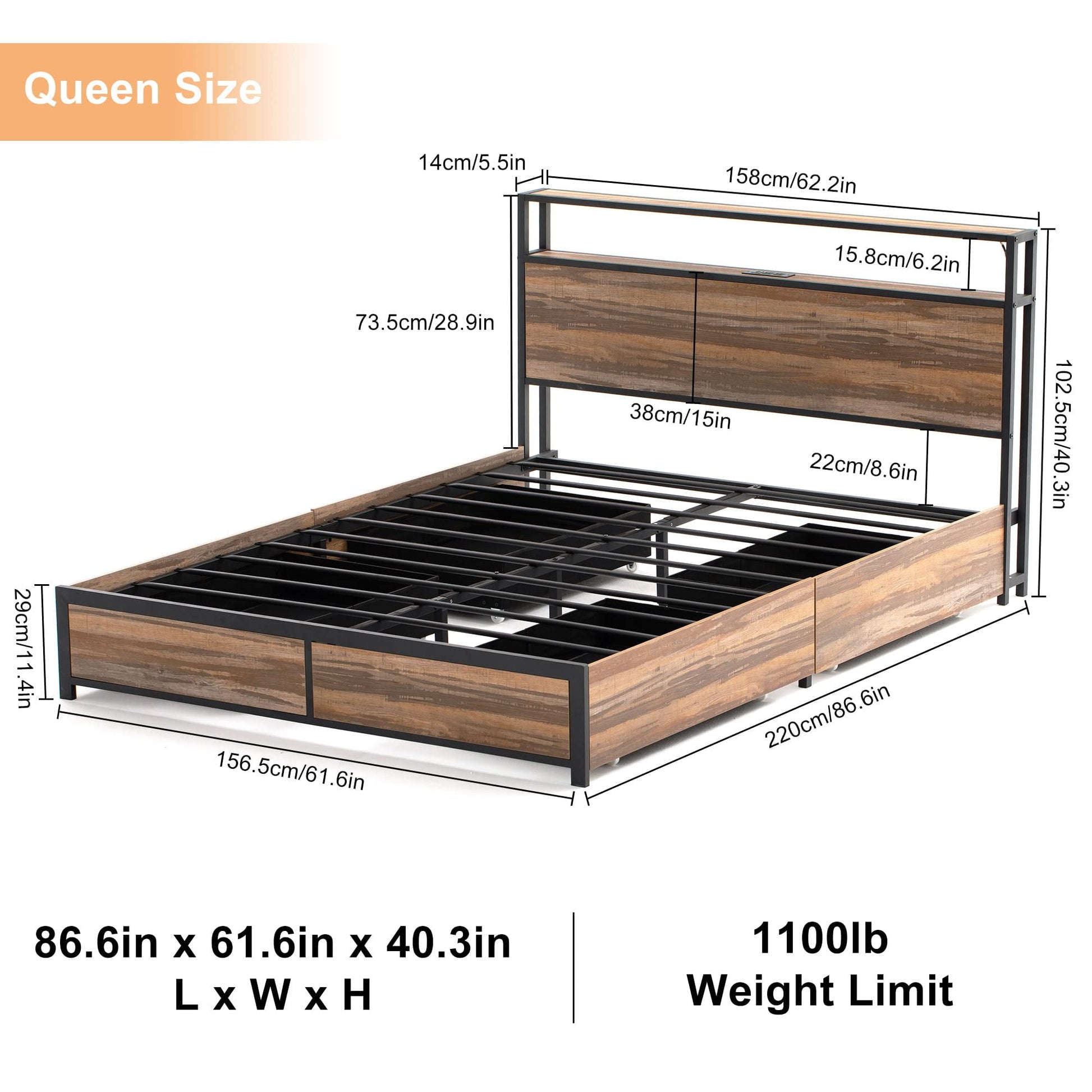????Queen Bed Frame Dimension is 86.6inch L x 61.6inch W x 40.6inch H, compatible all types of Queen Size Mattress.