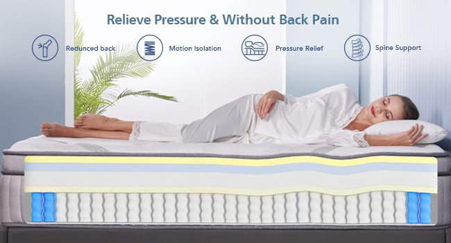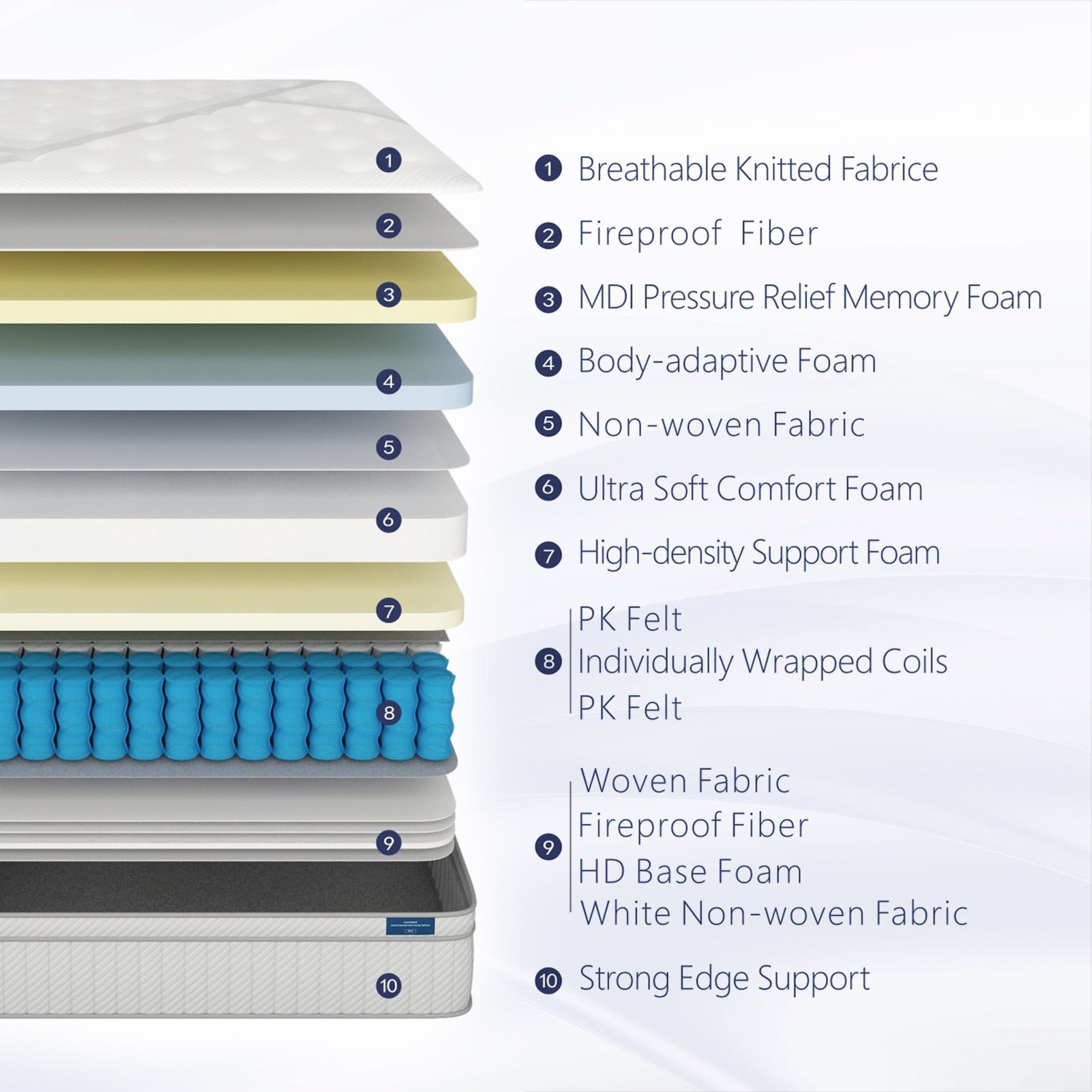 - [Plush Mattress Lovers' Choice]:This Euro Top hybrid mattress is composed of 5 layers of foam and independent spring.MDI memory foam that easily conforms to your body, providing a comfortable position for every inch of your body weight.Two layers of high thickness,Ultra soft and comfortable foam will give you the feeling of being in a cloud, putting you to sleep easily