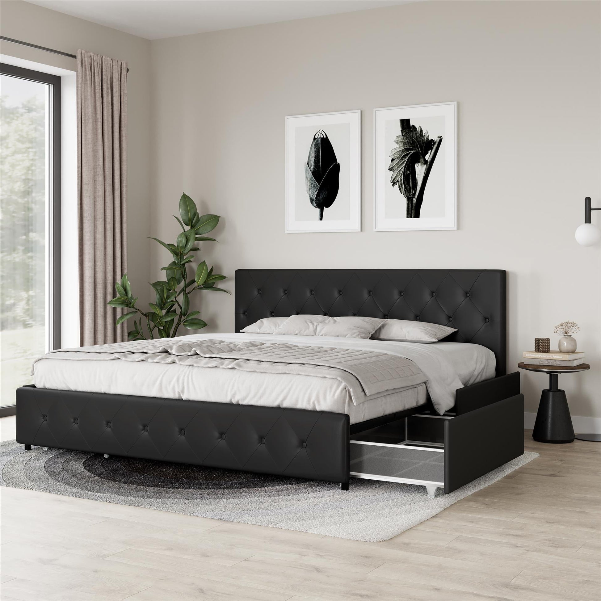 Give yourself the bed you deserve! The Dakota Upholstered Bed with Storage Drawers ticks off all the elements for a perfect bed - style, comfort and functionality. This contemporary and chic bed frame is designed with graceful button tufted diamond patterns on both the headboard and footboard and upholstered in faux leather. This contemporary frame is made with sturdy wood and includes a robust and durable wooden slats system, a center rail and supporting side rails that allow you to sleep blissfully on your favorite mattress without the slightest worry. The goodness doesn't stop there, the Dakota also comes with under bed built-in plastic drawers on wheels, which provide you the clever extra storage for bedding sets, out-of-season clothing, books, shoes and more. Use them with an organizer to separate your clothes or with containers to keep supplies away from any dust. Enjoy a wonderful doze of cozy and comfort with this understated elegant and well-crafted bed!