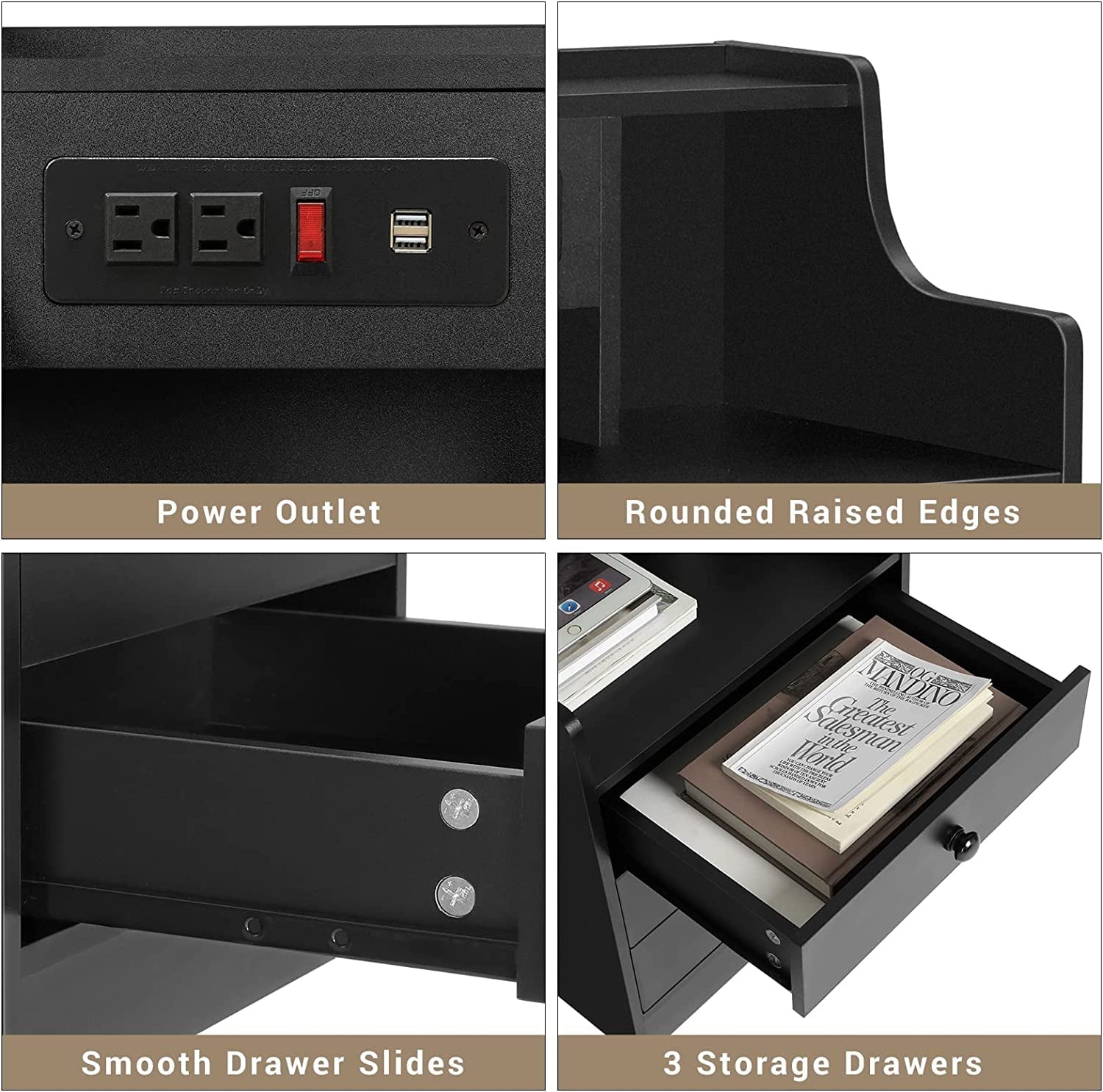 Nightstands Set of 2,Black Nightstand with Hutch and 3 Drawers,Bedside Table with Charging Station for Bedrooms
