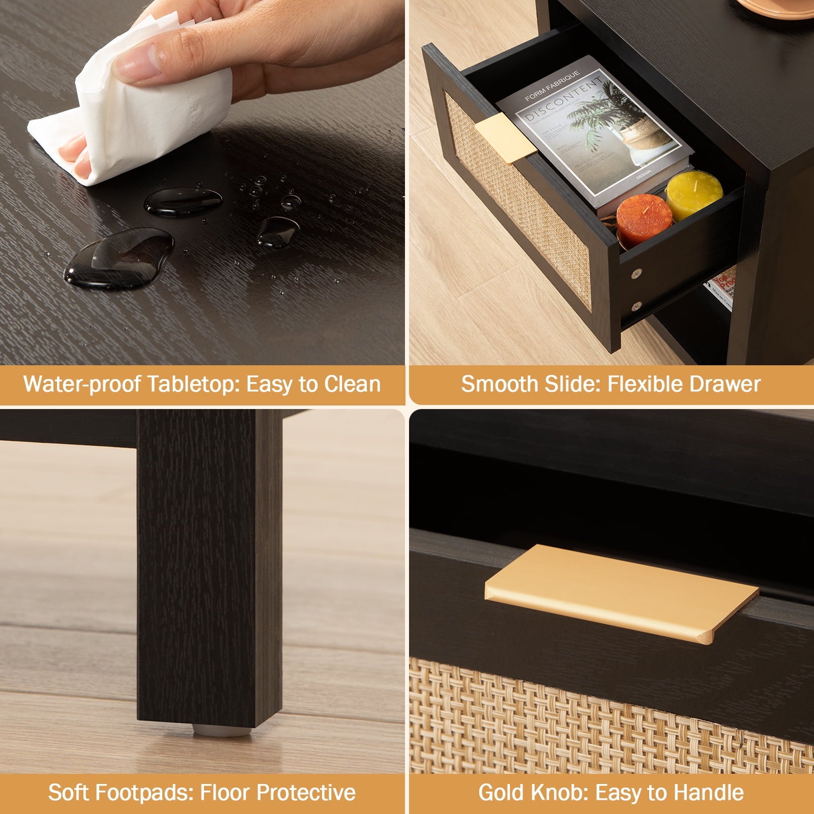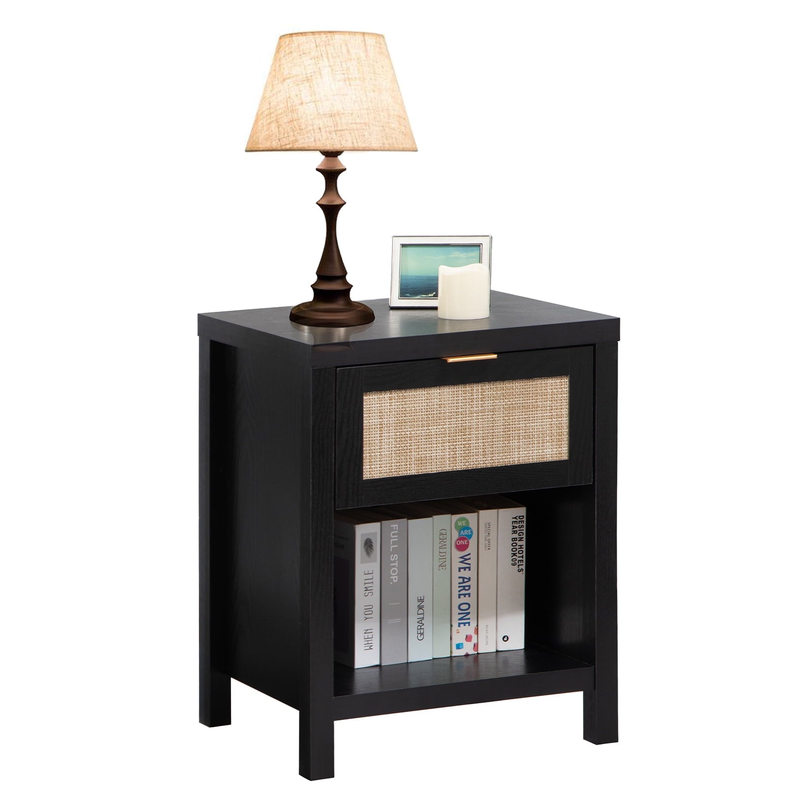 SINCEREFLY Rattan Nightstand with Drawer Boho Bedside Table with Open Shelf Black Night Stand for Bedroom