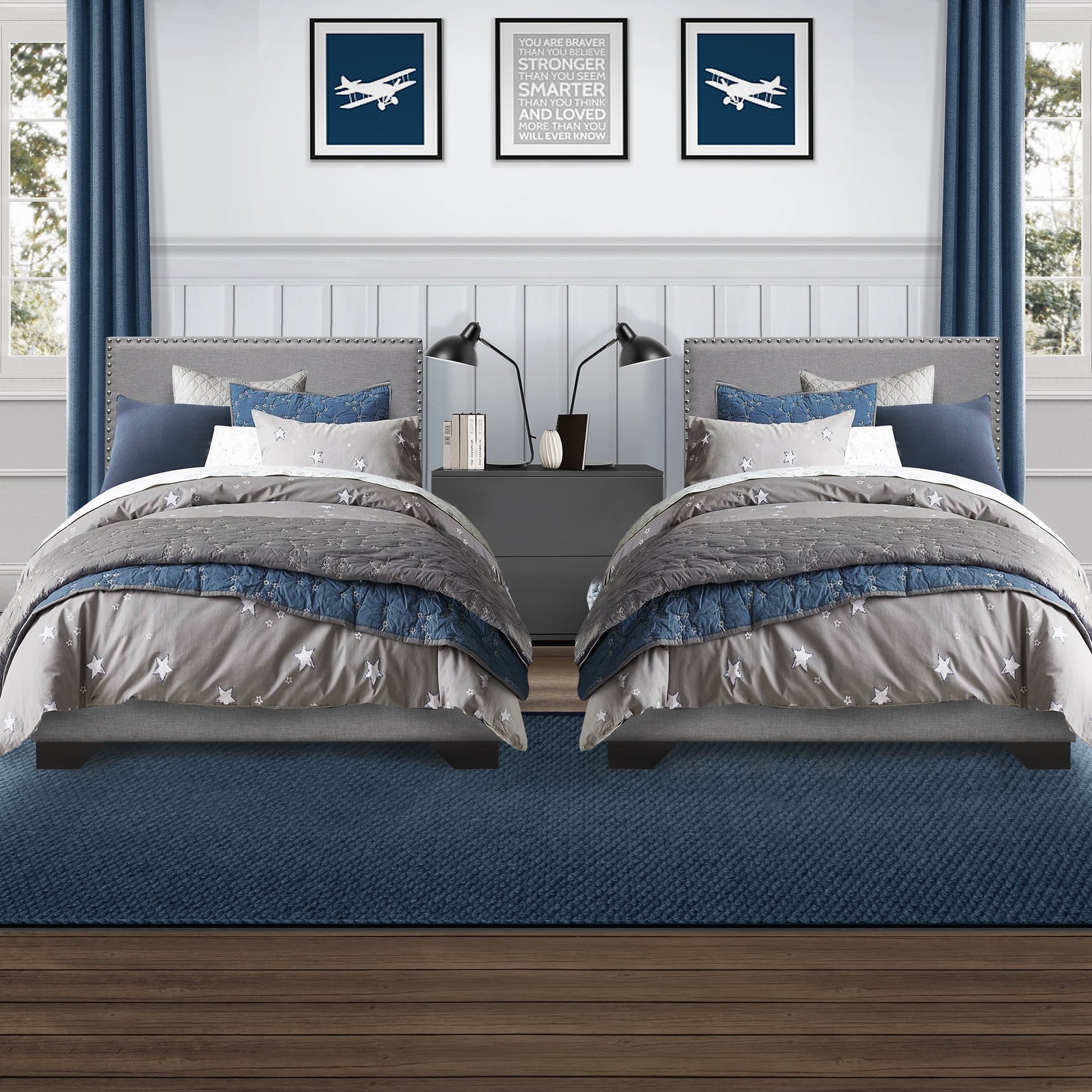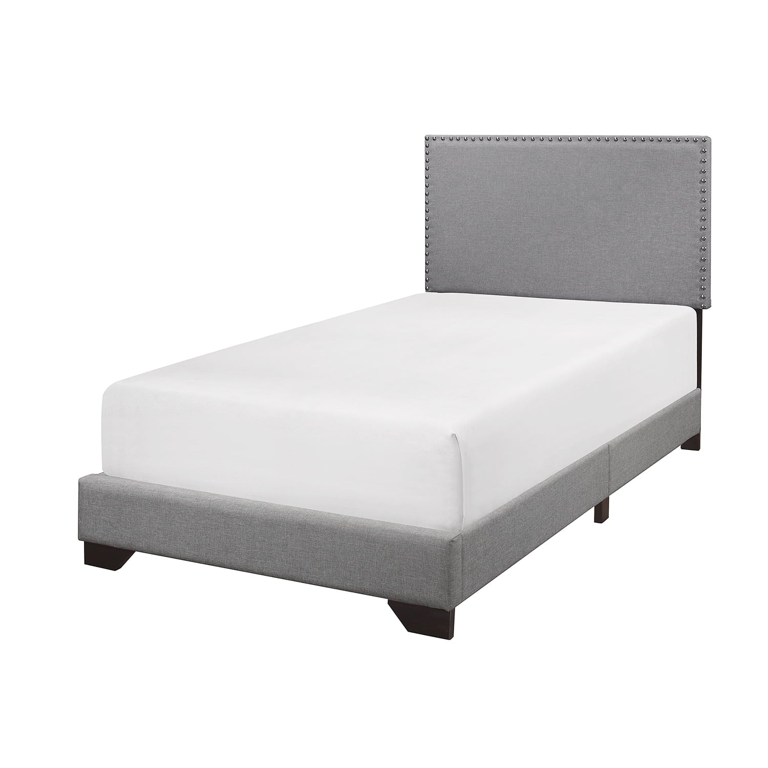 Add comfort, style and cozy vibes to your little or big kid's room with the Skylar upholstered platform bed. With 12 sturdy slats for the ultimate mattress support, you can throw those bulky box springs and bunky boards away, and create a cool, streamlined energy to your kid's decor. Transitional in style, with a squared headboard and nailhead trim, this bed is easy to blend into a room decorated with trains and football players or ballerinas and twinkle light. This bed is a \
