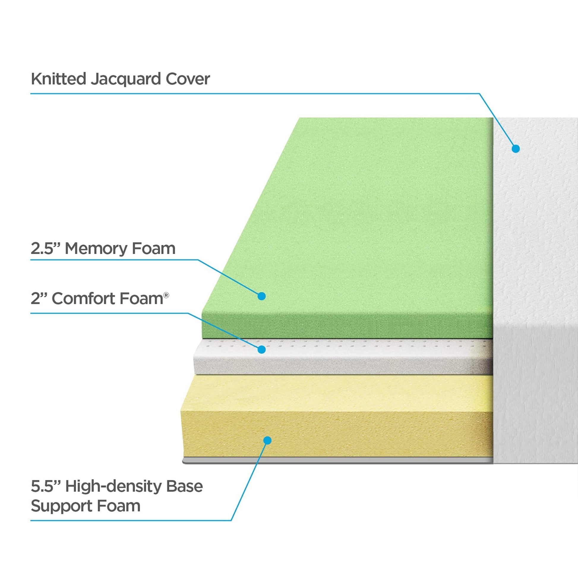 - Mattress layers include: 2.5 inches Memory Foam, 2 inches Pressure Relieving Comfort Foam, 5.5 Airflow High-density Base Support Foam